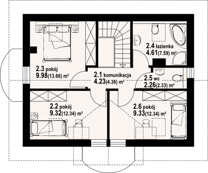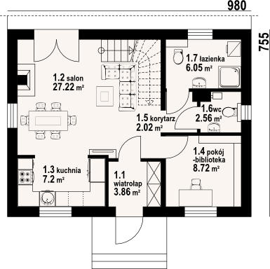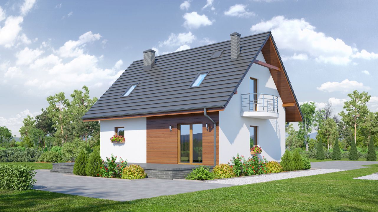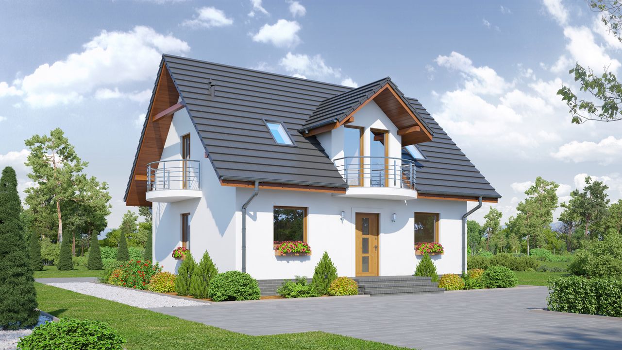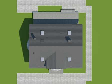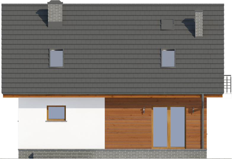 Graficzne opracowanie rzutów poglądowych widocznych na karcie projektu zostało wykonane przez Extradom.pl. Prezentowane przez Extradom.pl wizualizacje wykonane zostały przez autora projektu i należy poczytywać je jedynie za przykład i propozycję wykończenia, wizję architektoniczną autora projektu. Ostateczne wykończenie budynku może nastąpić na wiele sposobów. Szczegółowe rozwiązania zastosowane w oferowanej dokumentacji - w tym również ilość, lokalizacje i wygląd okien, drzwi, kominów - mogą w niewielkim stopniu różnić się od prezentowanej wizualizacji budynku.