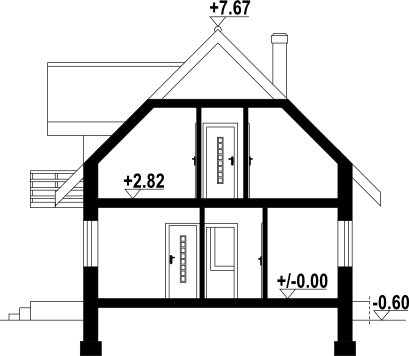 Wysokość ścianki kolankowej: 0.89 m. Strop: płyta żelbetowa. Pokrycie dachu: dachówka ceramiczna. Ściany zewnętrzne: pustaki ceramiczne + styropian. Ściany wewnętrzne: pustaki ceramiczne. Typ ogrzewania: kocioł gazowy.