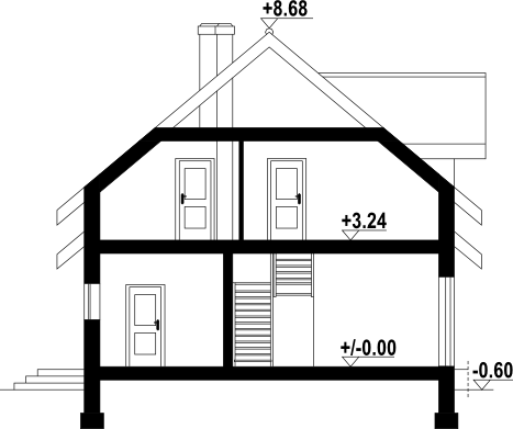 Wysokość ścianki kolankowej: 1.19 m. Strop: prefabrykowany. Pokrycie dachu: dachówka ceramiczna. Ściany zewnętrzne: bloczki z betonu komórkowego + styropian. Ściany wewnętrzne: bloczki z betonu komórkowego. Typ ogrzewania: kocioł gazowy lub kocioł na paliwo stałe. Instalacje dodatkowe: instalacja wentylacji mech. z rekuperacją. Inne: okna połaciowe Velux.