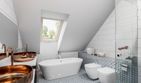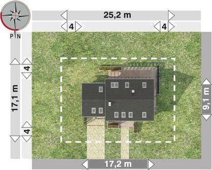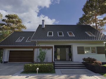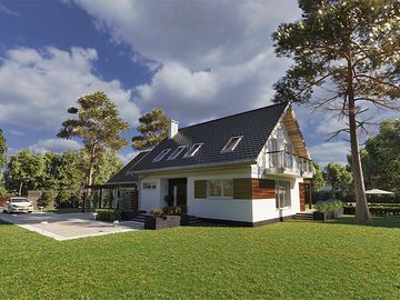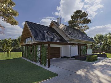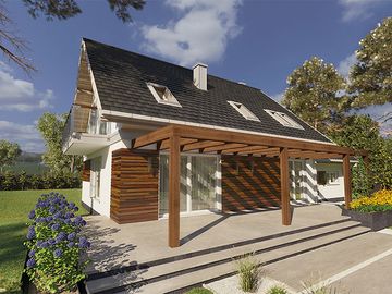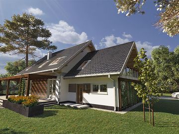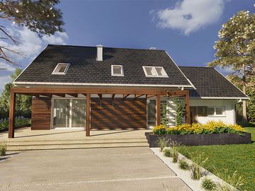Graficzne opracowanie rzutów poglądowych widocznych na karcie projektu zostało wykonane przez Extradom.pl. Prezentowane przez Extradom.pl wizualizacje wykonane zostały przez autora projektu i należy poczytywać je jedynie za przykład i propozycję wykończenia, wizję architektoniczną autora projektu. Ostateczne wykończenie budynku może nastąpić na wiele sposobów. Szczegółowe rozwiązania zastosowane w oferowanej dokumentacji - w tym również ilość, lokalizacje i wygląd okien, drzwi, kominów - mogą w niewielkim stopniu różnić się od prezentowanej wizualizacji budynku.