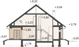 Konstrukcja ściany zewnętrzne - beton komórkowy gr.24cm + styropian Termo Organika Termonium Plus gr. 12cm; ściany wewnetrzne - bloczek silikatowy gr.24cm; ściany fundamentowe - bloczek betonowy; strop - Teriva; konstrukcja dachu - drewniana Instalacje W projekcie przewidziano instalacjie: c.o. i c.w.u., grzejniki płytowe, instalacje wodno-kanalizacyjna oraz elektryczne, wentylacja grawitacyjna. Wykończenie pokrycie dachowe - dachówka cementowa(w ramach adaptacji inny materiał); ścianki działowe na parterze-bloczki silikatowe; na poddaszu z płyt gipsowo-kartonowych; schody drewniane - zabiegowe ze spocznikami; okna - PVC, okna dachowe i wyłaz dachowy - Fakro.