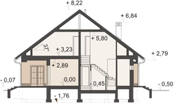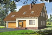 Konstrukcja ściany zewnętrzne - beton komórkowy gr.24cm + styropian Termo Organika Termonium Plus gr. 12cm; ściany wewnetrzne - bloczek silikatowy gr.24cm; ściany fundamentowe - bloczek betonowy; strop - Teriva I; konstrukcja dachu - drewniana Instalacje W projekcie przewidziano instalacjie: c.o. i c.w.u., grzejniki płytowe, instalacje wodno-kanalizacyjna oraz elektryczne, wentylacja grawitacyjna. Wykończenie pokrycie dachowe - dachówka cementowa(w ramach adaptacji inny materiał); ścianki działowe na parterze-bloczki silikatowe; na poddaszu z płyt gipsowo-kartonowych; schody drewniane - zabiegowe ze spocznikami; okna - PVC, okna dachowe i wyłaz dachowy - Fakro.