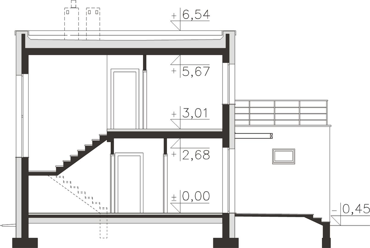 Fundamenty - rozwiązanie o podwyższonej izolacji termicznej. Ściany zewnętrzne - Bloczek silikatowy 24 cm + styropian 20 cm. Strop - gęstożebrowy. Dach - stropodach żelbetowy. Ogrzewanie - c.o. grzejnikowe + c.w.u. - kocioł gazowy. Wentylacja - rekuperacja.