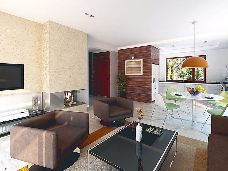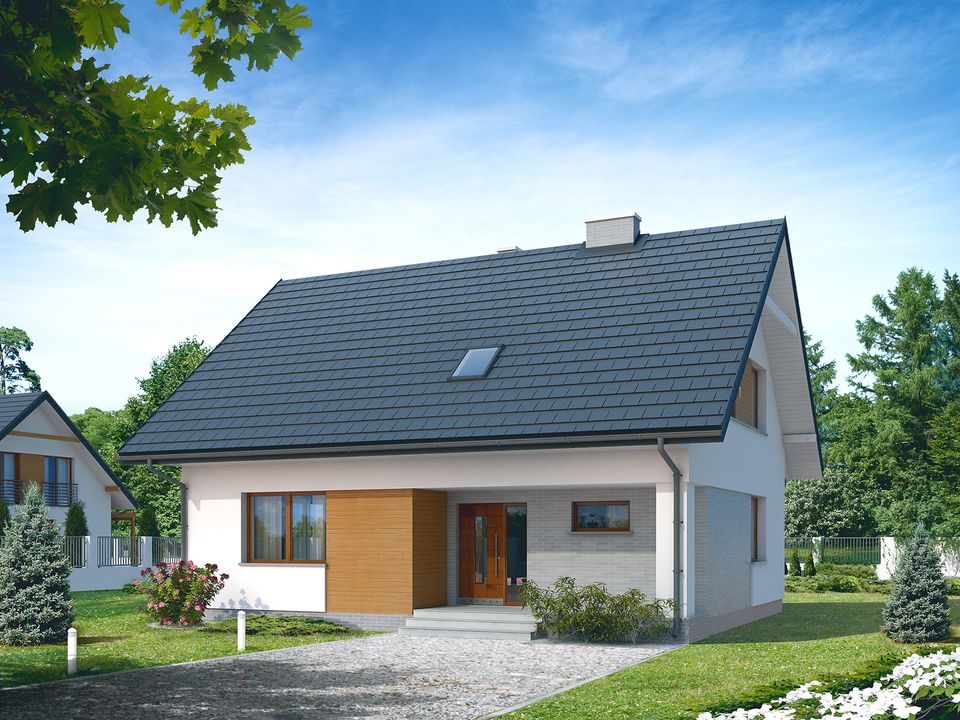 Graficzne opracowanie rzutów poglądowych widocznych na karcie projektu zostało wykonane przez Extradom.pl. Prezentowane przez Extradom.pl wizualizacje wykonane zostały przez autora projektu i należy poczytywać je jedynie za przykład i propozycję wykończenia, wizję architektoniczną autora projektu. Ostateczne wykończenie budynku może nastąpić na wiele sposobów. Szczegółowe rozwiązania zastosowane w oferowanej dokumentacji - w tym również ilość, lokalizacje i wygląd okien, drzwi, kominów - mogą w niewielkim stopniu różnić się od prezentowanej wizualizacji budynku.
