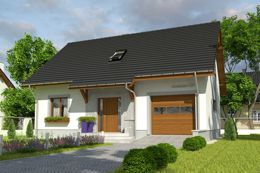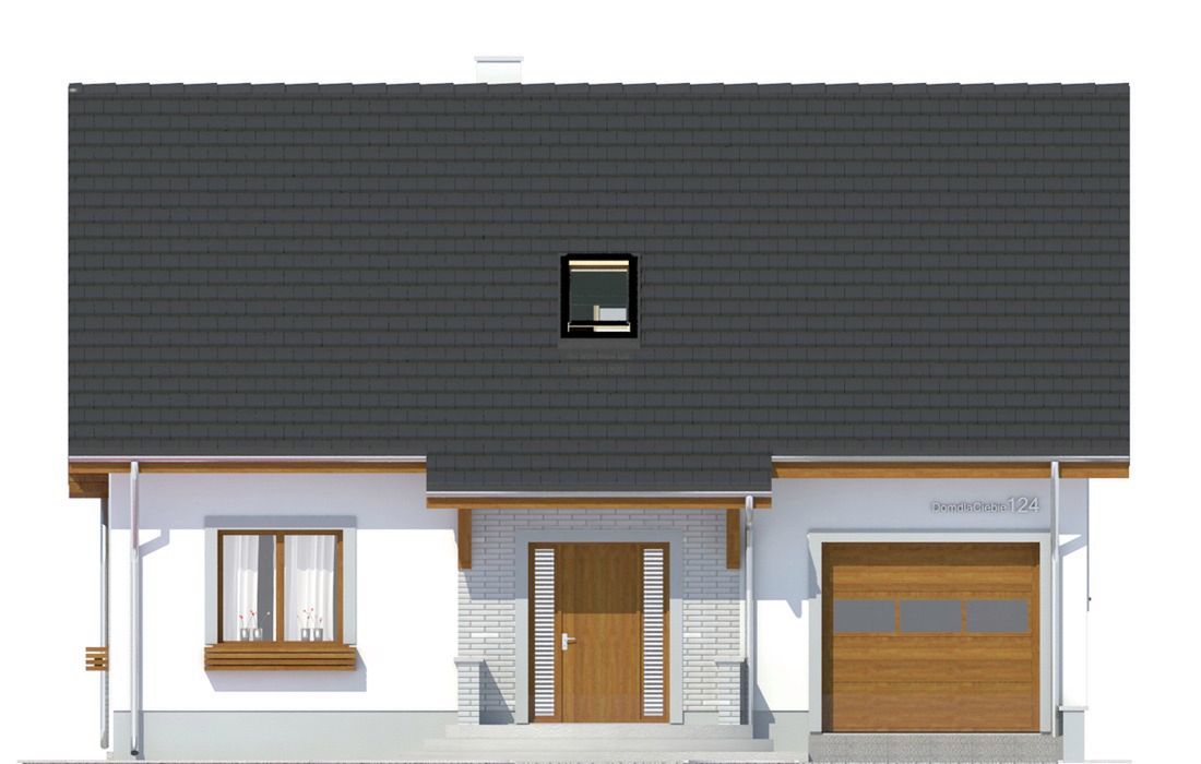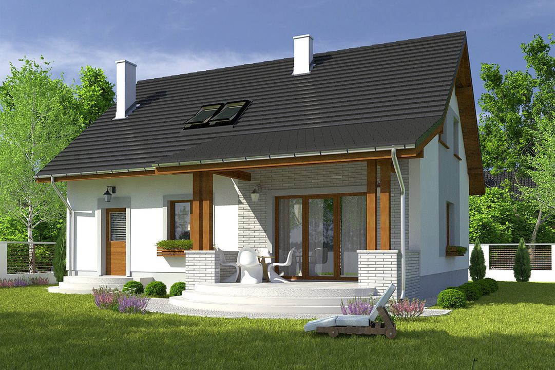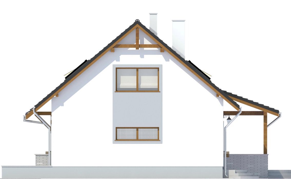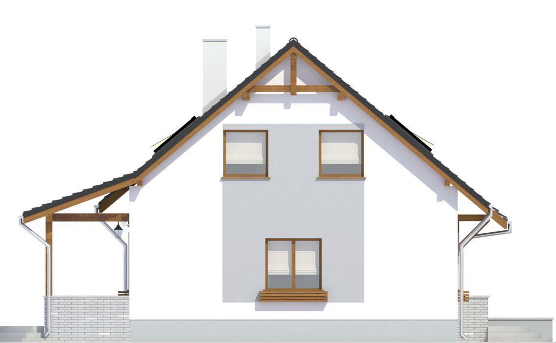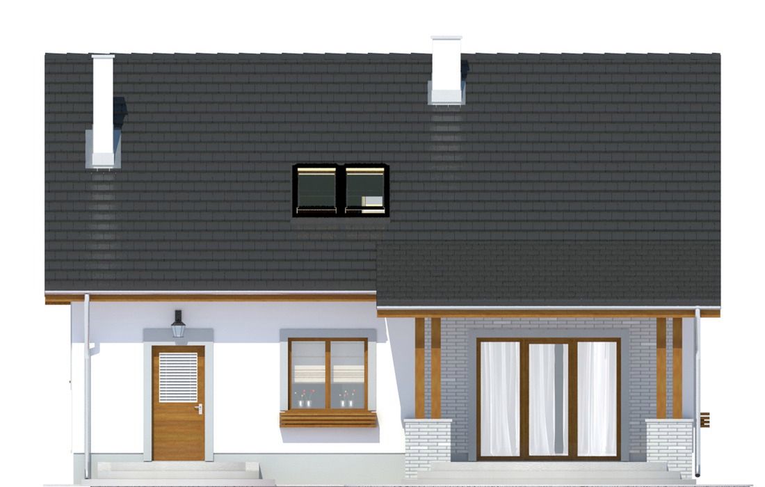 Graficzne opracowanie rzutów poglądowych widocznych na karcie projektu zostało wykonane przez Extradom.pl. Prezentowane przez Extradom.pl wizualizacje wykonane zostały przez autora projektu i należy poczytywać je jedynie za przykład i propozycję wykończenia, wizję architektoniczną autora projektu. Ostateczne wykończenie budynku może nastąpić na wiele sposobów. Szczegółowe rozwiązania zastosowane w oferowanej dokumentacji - w tym również ilość, lokalizacje i wygląd okien, drzwi, kominów - mogą w niewielkim stopniu różnić się od prezentowanej wizualizacji budynku.