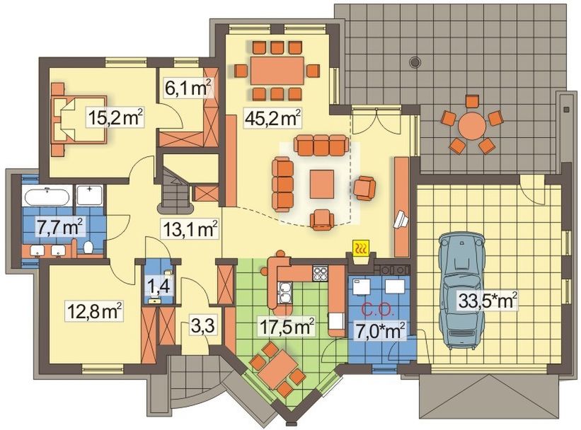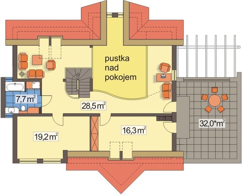 Graficzne opracowanie rzutów poglądowych widocznych na karcie projektu zostało wykonane przez Extradom.pl. Prezentowane przez Extradom.pl wizualizacje wykonane zostały przez autora projektu i należy poczytywać je jedynie za przykład i propozycję wykończenia, wizję architektoniczną autora projektu. Ostateczne wykończenie budynku może nastąpić na wiele sposobów. Szczegółowe rozwiązania zastosowane w oferowanej dokumentacji - w tym również ilość, lokalizacje i wygląd okien, drzwi, kominów - mogą w niewielkim stopniu różnić się od prezentowanej wizualizacji budynku.