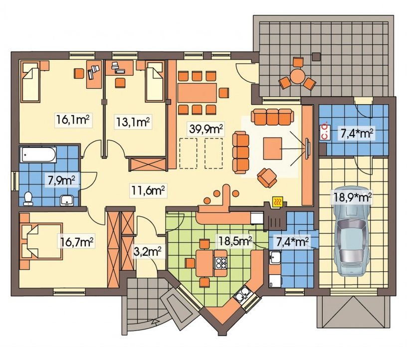 Graficzne opracowanie rzutów poglądowych widocznych na karcie projektu zostało wykonane przez Extradom.pl. Prezentowane przez Extradom.pl wizualizacje wykonane zostały przez autora projektu i należy poczytywać je jedynie za przykład i propozycję wykończenia, wizję architektoniczną autora projektu. Ostateczne wykończenie budynku może nastąpić na wiele sposobów. Szczegółowe rozwiązania zastosowane w oferowanej dokumentacji - w tym również ilość, lokalizacje i wygląd okien, drzwi, kominów - mogą w niewielkim stopniu różnić się od prezentowanej wizualizacji budynku.