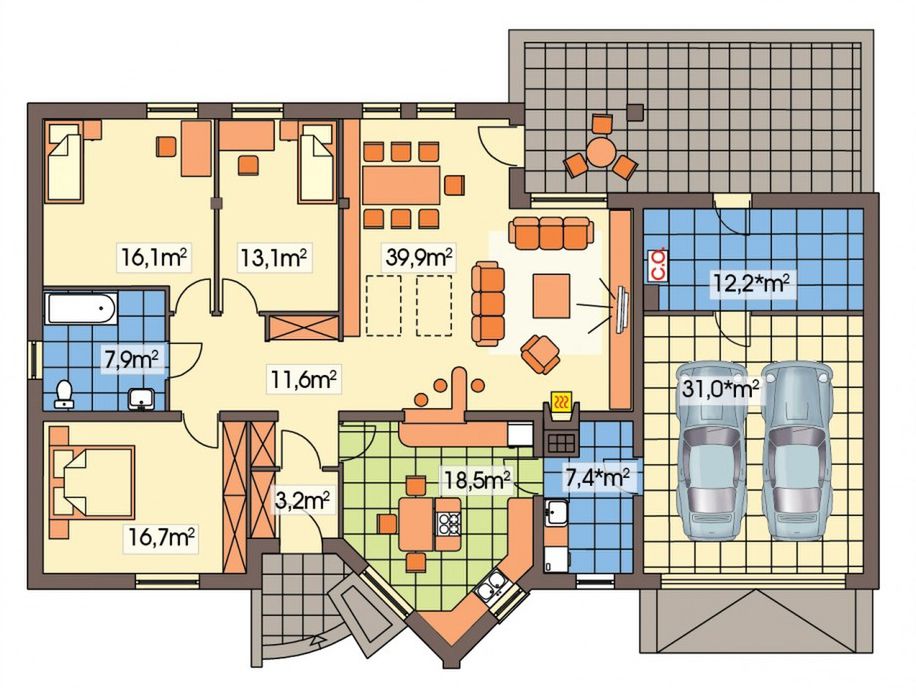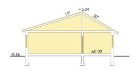 Graficzne opracowanie rzutów poglądowych widocznych na karcie projektu zostało wykonane przez Extradom.pl. Prezentowane przez Extradom.pl wizualizacje wykonane zostały przez autora projektu i należy poczytywać je jedynie za przykład i propozycję wykończenia, wizję architektoniczną autora projektu. Ostateczne wykończenie budynku może nastąpić na wiele sposobów. Szczegółowe rozwiązania zastosowane w oferowanej dokumentacji - w tym również ilość, lokalizacje i wygląd okien, drzwi, kominów - mogą w niewielkim stopniu różnić się od prezentowanej wizualizacji budynku.