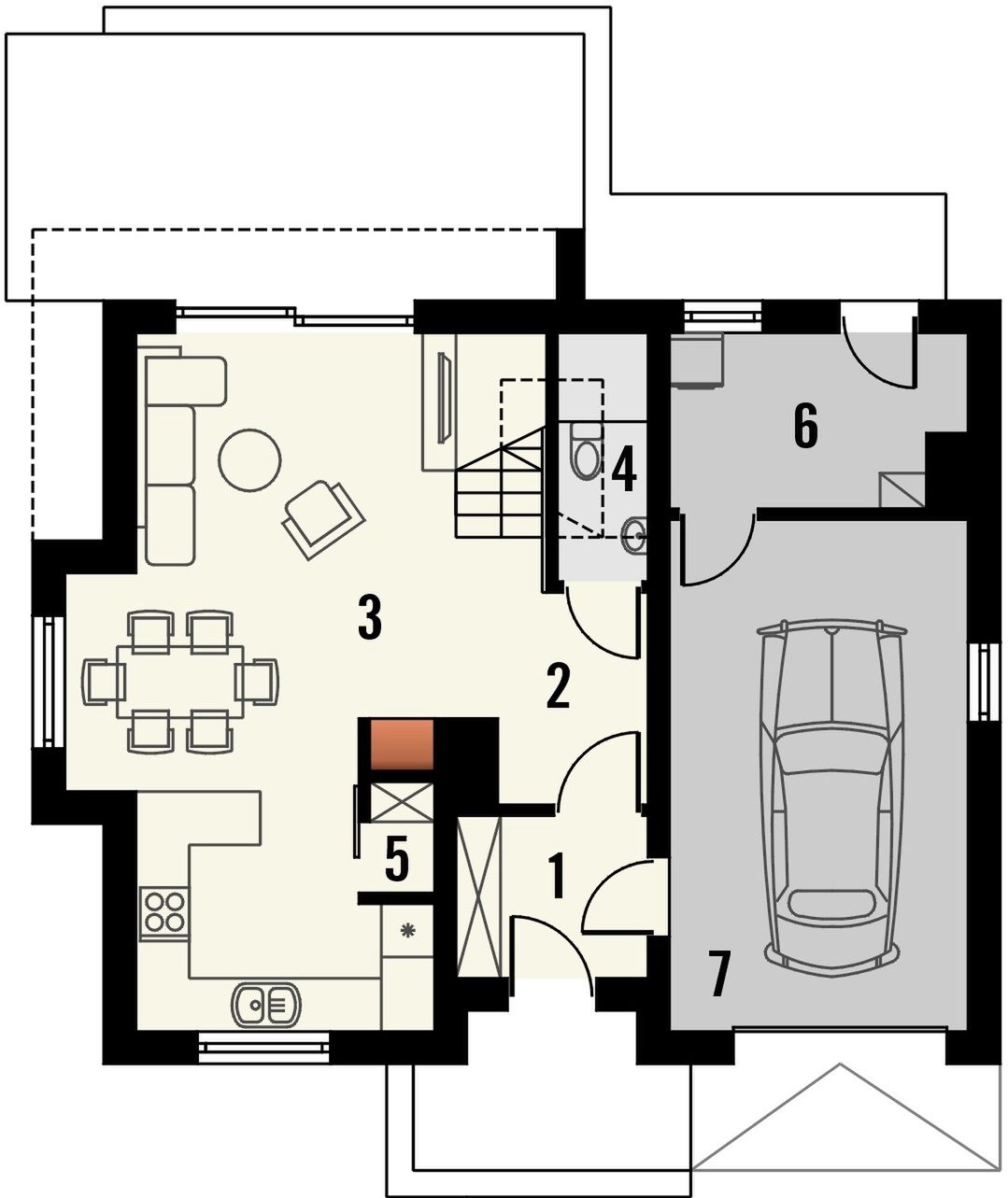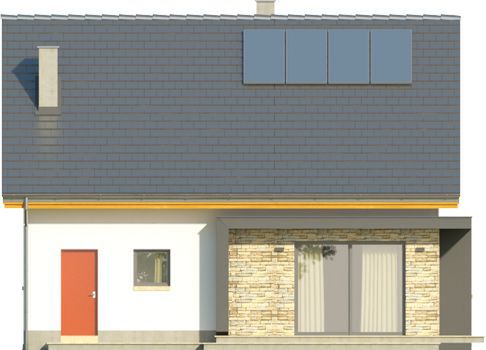 Graficzne opracowanie rzutów poglądowych widocznych na karcie projektu zostało wykonane przez Extradom.pl. Prezentowane przez Extradom.pl wizualizacje wykonane zostały przez autora projektu i należy poczytywać je jedynie za przykład i propozycję wykończenia, wizję architektoniczną autora projektu. Ostateczne wykończenie budynku może nastąpić na wiele sposobów. Szczegółowe rozwiązania zastosowane w oferowanej dokumentacji - w tym również ilość, lokalizacje i wygląd okien, drzwi, kominów - mogą w niewielkim stopniu różnić się od prezentowanej wizualizacji budynku.