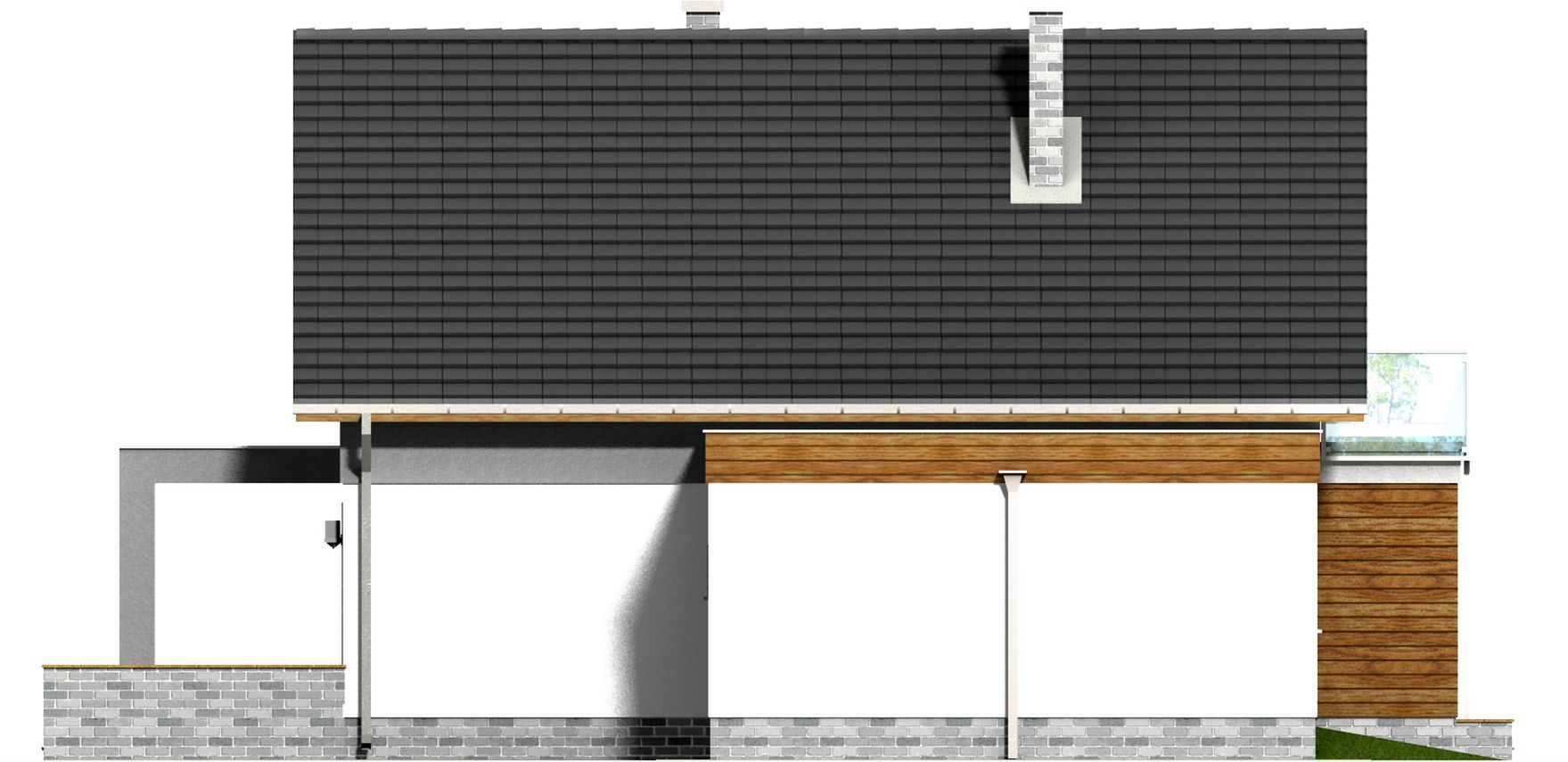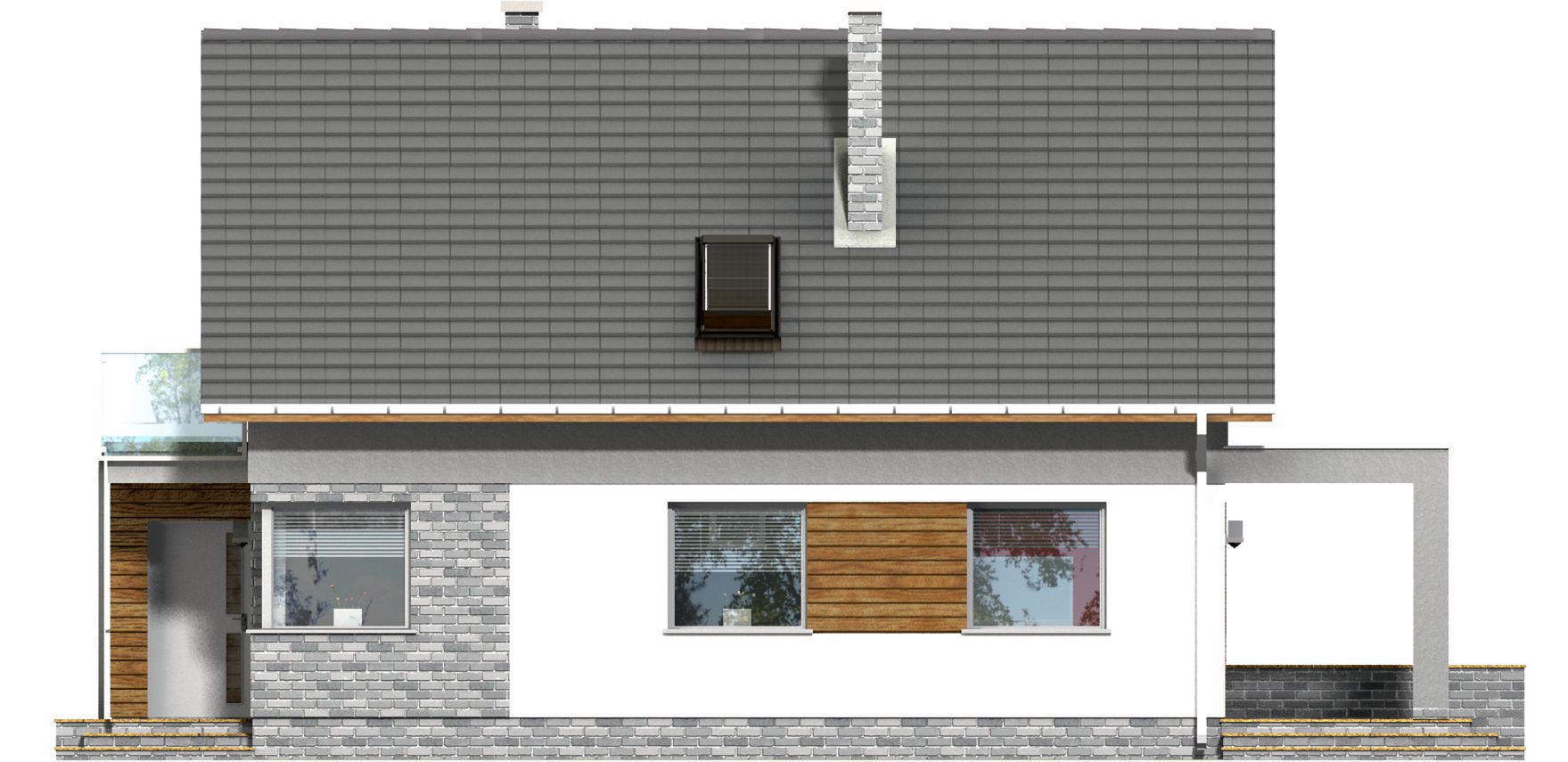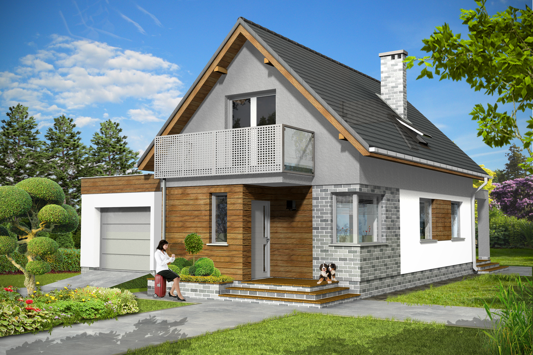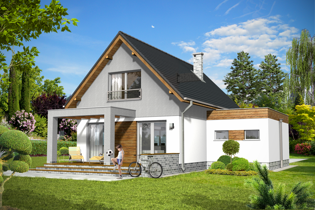 Graficzne opracowanie rzutów poglądowych widocznych na karcie projektu zostało wykonane przez Extradom.pl. Prezentowane przez Extradom.pl wizualizacje wykonane zostały przez autora projektu i należy poczytywać je jedynie za przykład i propozycję wykończenia, wizję architektoniczną autora projektu. Ostateczne wykończenie budynku może nastąpić na wiele sposobów. Szczegółowe rozwiązania zastosowane w oferowanej dokumentacji - w tym również ilość, lokalizacje i wygląd okien, drzwi, kominów - mogą w niewielkim stopniu różnić się od prezentowanej wizualizacji budynku.