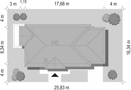 Fundamenty: żelbetowe wylewane. Ściany zewnętrzne: pustaki ceramiczne max + styropian. Strop: drewniany. Elewacje: tynk cienkopowłokowy. Pokrycie dachu: dachówka ceramiczna lub blachodachówka. Nachylenie dachu: 30 stopni.