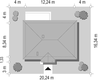 Fundamenty: betonowe. Ściany: gazobeton + styropian, porotherm + styropian, lub szkielet drewniany. Elewacje: tynk cienkowarstwowy. Pokrycie dachu: dachówka ceramiczna lub betonowa. Nachylenie dachu: 24 stopnie.