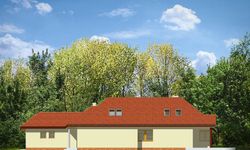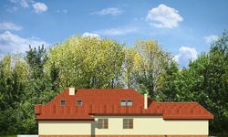 Graficzne opracowanie rzutów poglądowych widocznych na karcie projektu zostało wykonane przez Extradom.pl. Prezentowane przez Extradom.pl wizualizacje wykonane zostały przez autora projektu i należy poczytywać je jedynie za przykład i propozycję wykończenia, wizję architektoniczną autora projektu. Ostateczne wykończenie budynku może nastąpić na wiele sposobów. Szczegółowe rozwiązania zastosowane w oferowanej dokumentacji - w tym również ilość, lokalizacje i wygląd okien, drzwi, kominów - mogą w niewielkim stopniu różnić się od prezentowanej wizualizacji budynku.