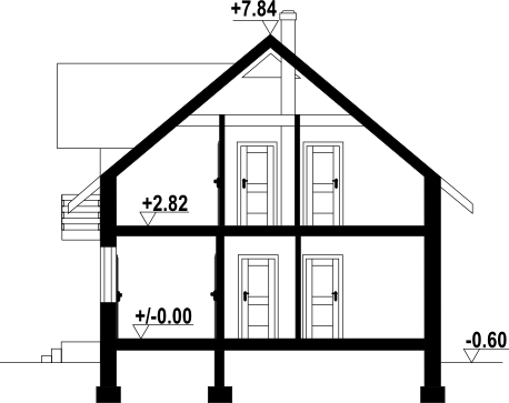 Wysokość ścianki kolankowej: 1.2 m. Strop: płyta żelbetowa. Pokrycie dachu: dachówka ceramiczna. Ściany zewnętrzne: pustaki ceramiczne + styropian. Ściany wewnętrzne: pustaki ceramiczne. Typ ogrzewania: kocioł gazowy.