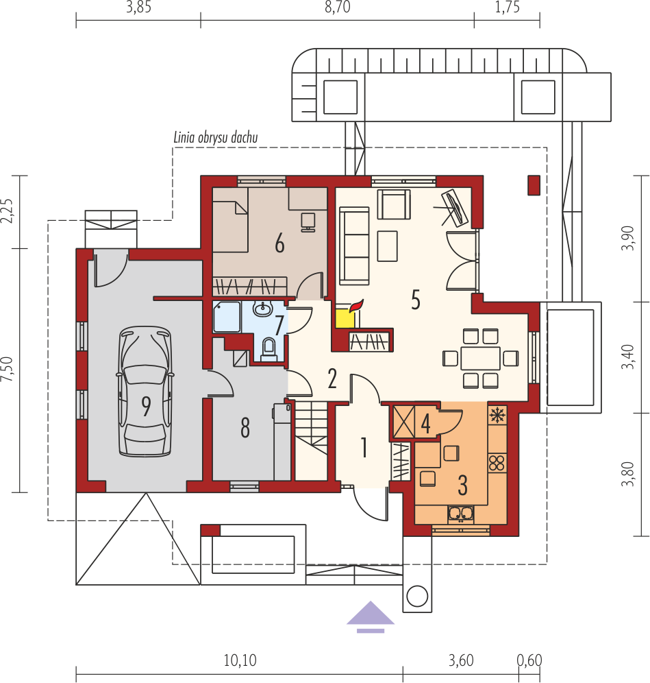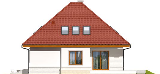 Graficzne opracowanie rzutów poglądowych widocznych na karcie projektu zostało wykonane przez Extradom.pl. Prezentowane przez Extradom.pl wizualizacje wykonane zostały przez autora projektu i należy poczytywać je jedynie za przykład i propozycję wykończenia, wizję architektoniczną autora projektu. Ostateczne wykończenie budynku może nastąpić na wiele sposobów. Szczegółowe rozwiązania zastosowane w oferowanej dokumentacji - w tym również ilość, lokalizacje i wygląd okien, drzwi, kominów - mogą w niewielkim stopniu różnić się od prezentowanej wizualizacji budynku.