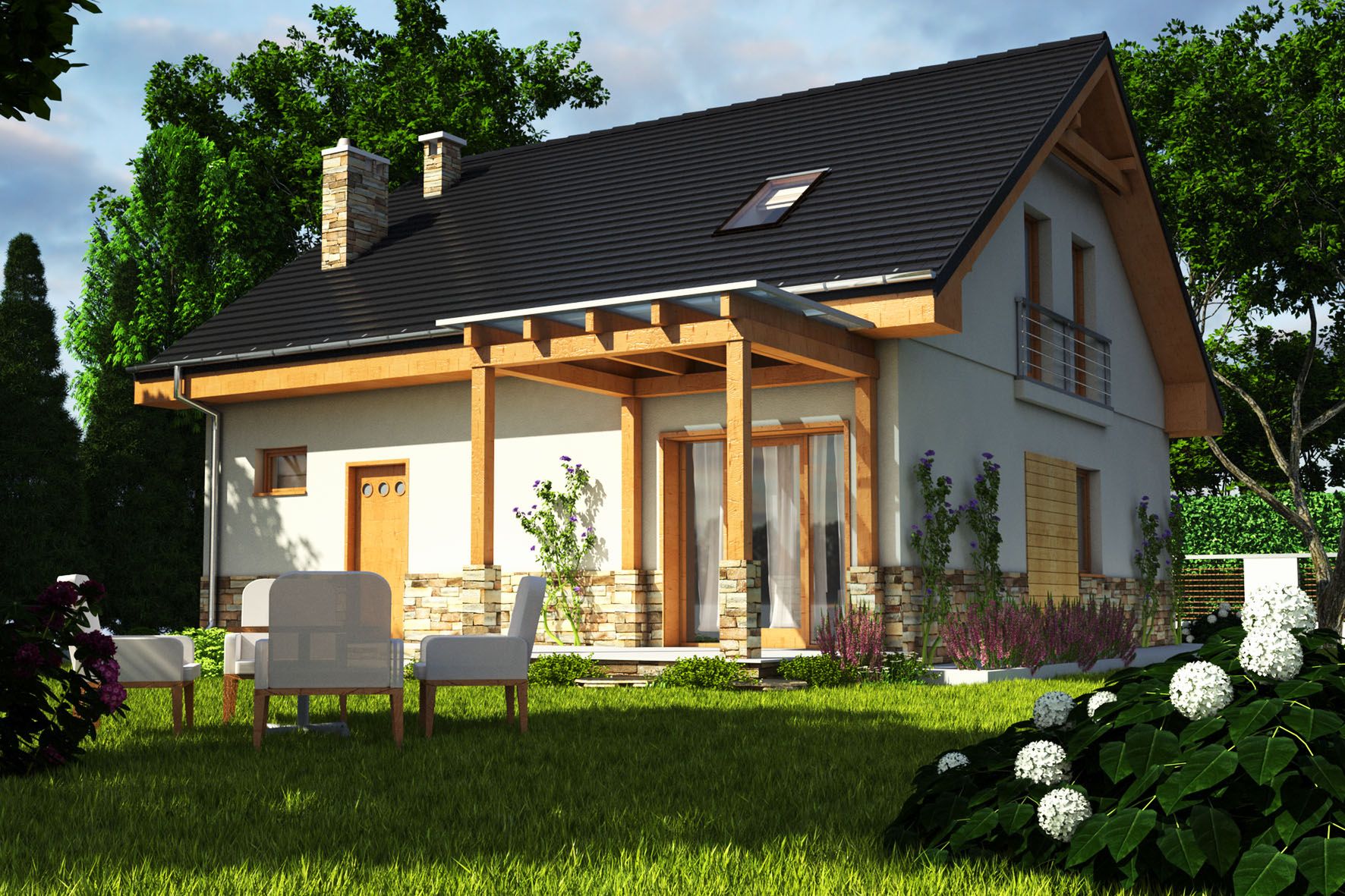Graficzne opracowanie rzutów poglądowych widocznych na karcie projektu zostało wykonane przez Extradom.pl. Prezentowane przez Extradom.pl wizualizacje wykonane zostały przez autora projektu i należy poczytywać je jedynie za przykład i propozycję wykończenia, wizję architektoniczną autora projektu. Ostateczne wykończenie budynku może nastąpić na wiele sposobów. Szczegółowe rozwiązania zastosowane w oferowanej dokumentacji - w tym również ilość, lokalizacje i wygląd okien, drzwi, kominów - mogą w niewielkim stopniu różnić się od prezentowanej wizualizacji budynku.