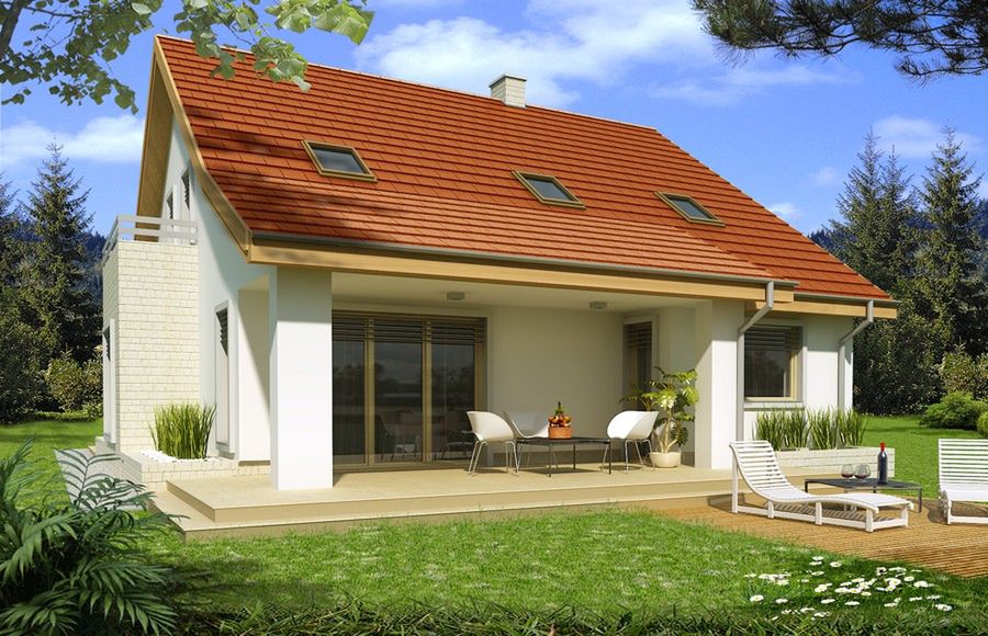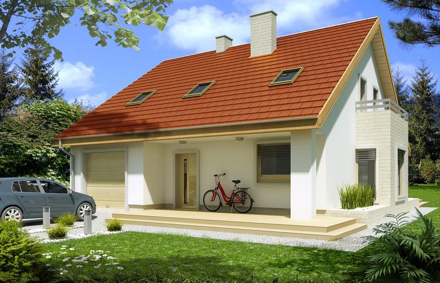 Strop: gęstożebrowy Teriva. Ściany zewnętrzne: gazobeton. Pokrycie dachowe: dachówka. Okna połaciowe: Fakro. Fundamentowanie: Ławy fundamentowe.
