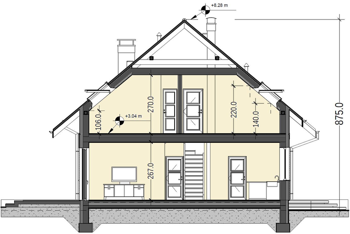 Posadowienie bezpośrednie na zbrojonych ławach i stopach fundamentowych wykonanych z betonu B 20. Ściany fundamentowe: murowane z bloczków betonowych M6. Ściany zewnętrzne: bloczki gazobetonowe gr. 25cm na zaprawie systemowej, ciepłochronnej, ocieplony styropianem fasadowym gr. 15cm. Do ocieplenia budynku zaprojektowano użycie styropianu grafitowego gr. 15 cm, o współczynniku „lambda” nie przekraczającym 0,035 W(mK) i „oporze cieplnym” nie mniejszym niż Rd – 4,0 m2k/W. Zastosowanie materiałów budowlanych (ocieplenie ścian, dachu, podłogi na gruncie, okien i drzwi zewnętrznych) użytych w projekcie odpowiada nowym wymaganiom obowiązującym od stycznia 2021 roku (WT2021). Ściany nośne wewnętrzne: bloczki gazobetonowe gr. 25cm na zaprawie cementowo-wapiennej lub systemowej. Ściany wewnętrzne działowe: bloczki gazobetonowe gr. 12cm. Strop gęstożebrowy z wypełnieniem pustakami betonowymi, zalewany wraz z wieńcami betonem B 20. Konstrukcja dachu: drewniana, drewno klasy C24, więźba dachowa krokwiowo-jętkowa. Budynek, w wersji podstawowej, jest zaprojektowany z pomieszczeniem kotłowni wyposażonej w kocioł ekologiczny na paliwo stałe, biomasę (granulat drzewny – pellet) i spełnia wszystkie wymagania dotyczące WT2021. Istnieje możliwość zamówienia dokumentacji projektowej w wersji ogrzewania gazowego ze wspomaganiem instalacją solarną lub ogrzewania nowoczesną pompa ciepła typu powietrze – woda i ogrzewaniem podłogowym (zapytaj o cenę). Standard energetyczny budynku, w każdej wersji ogrzewania jest w pełni spełniający wymagania WT2021, przegrody spełniają wymagania dla standardu NF40. Projekt pod względem konstrukcyjnym spełnia normy zgodne z Eurokodami.