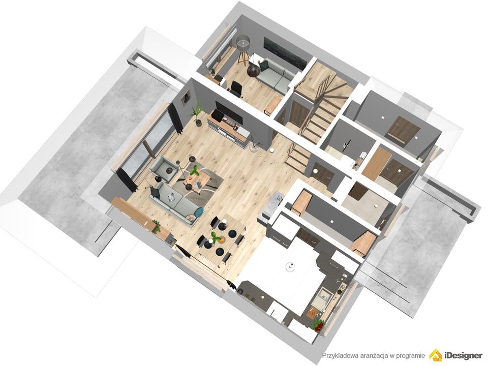Graficzne opracowanie rzutów poglądowych widocznych na karcie projektu zostało wykonane przez Extradom.pl. Prezentowane przez Extradom.pl wizualizacje wykonane zostały przez autora projektu i należy poczytywać je jedynie za przykład i propozycję wykończenia, wizję architektoniczną autora projektu. Ostateczne wykończenie budynku może nastąpić na wiele sposobów. Szczegółowe rozwiązania zastosowane w oferowanej dokumentacji - w tym również ilość, lokalizacje i wygląd okien, drzwi, kominów - mogą w niewielkim stopniu różnić się od prezentowanej wizualizacji budynku.