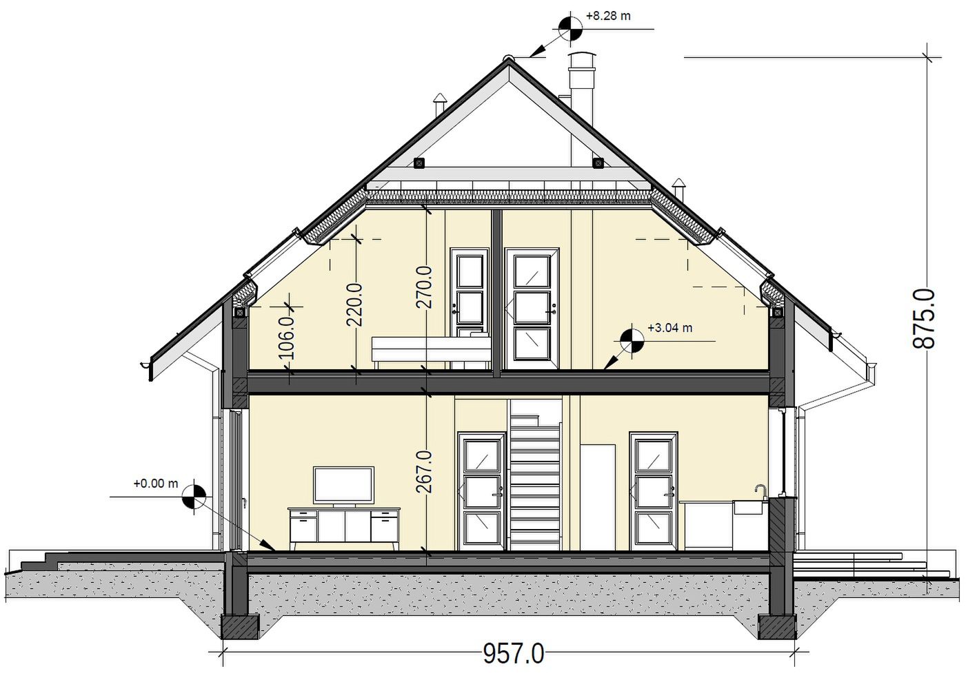 Posadowienie bezpośrednie na zbrojonych ławach i stopach fundamentowych wykonanych z betonu B 20. Ściany fundamentowe: murowane z bloczków betonowych M6. Ściany zewnętrzne: bloczki gazobetonowe gr. 24/25cm na zaprawie systemowej, ciepłochronnej, ocieplony styropianem fasadowym gr. 15cm. Do ocieplenia budynku zaprojektowano użycie styropianu grafitowego gr. 15 cm, o współczynniku „lambda” nie przekraczającym 0,035 W(mK) i „oporze cieplnym” nie mniejszym niż Rd – 4,0 m2k/W. Zastosowanie materiałów budowlanych (ocieplenie ścian, dachu, podłogi na gruncie, okien i drzwi zewnętrznych) użytych w projekcie odpowiada nowym wymaganiom obowiązującym od stycznia 2021 roku (WT2021). Ściany nośne wewnętrzne: bloczki gazobetonowe gr. 25cm na zaprawie cementowo-wapiennej lub systemowej. Ściany wewnętrzne działowe: bloczki gazobetonowe gr. 12cm. Strop gęstożebrowy z wypełnieniem pustakami betonowymi, zalewany wraz z wieńcami betonem B 20. Konstrukcja dachu: drewniana, drewno klasy C24, więźba dachowa krokwiowo-jętkowa. Budynek, w wersji podstawowej, jest zaprojektowany z pomieszczeniem kotłowni wyposażonej w kocioł ekologiczny na paliwo stałe, biomasę (granulat drzewny – pellet) i spełnia wszystkie wymagania dotyczące WT2021. Istnieje możliwość zamówienia dokumentacji projektowej w wersji ogrzewania gazowego ze wspomaganiem instalacją solarną lub ogrzewania nowoczesną pompa ciepła typu powietrze – woda i ogrzewaniem podłogowym (zapytaj o cenę). Standard energetyczny budynku, w każdej wersji ogrzewania jest w pełni spełniający wymagania WT2021, przegrody spełniają wymagania dla standardu NF40. Projekt pod względem konstrukcyjnym spełnia normy zgodne z Eurokodami.