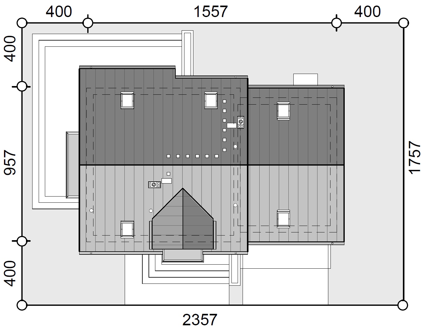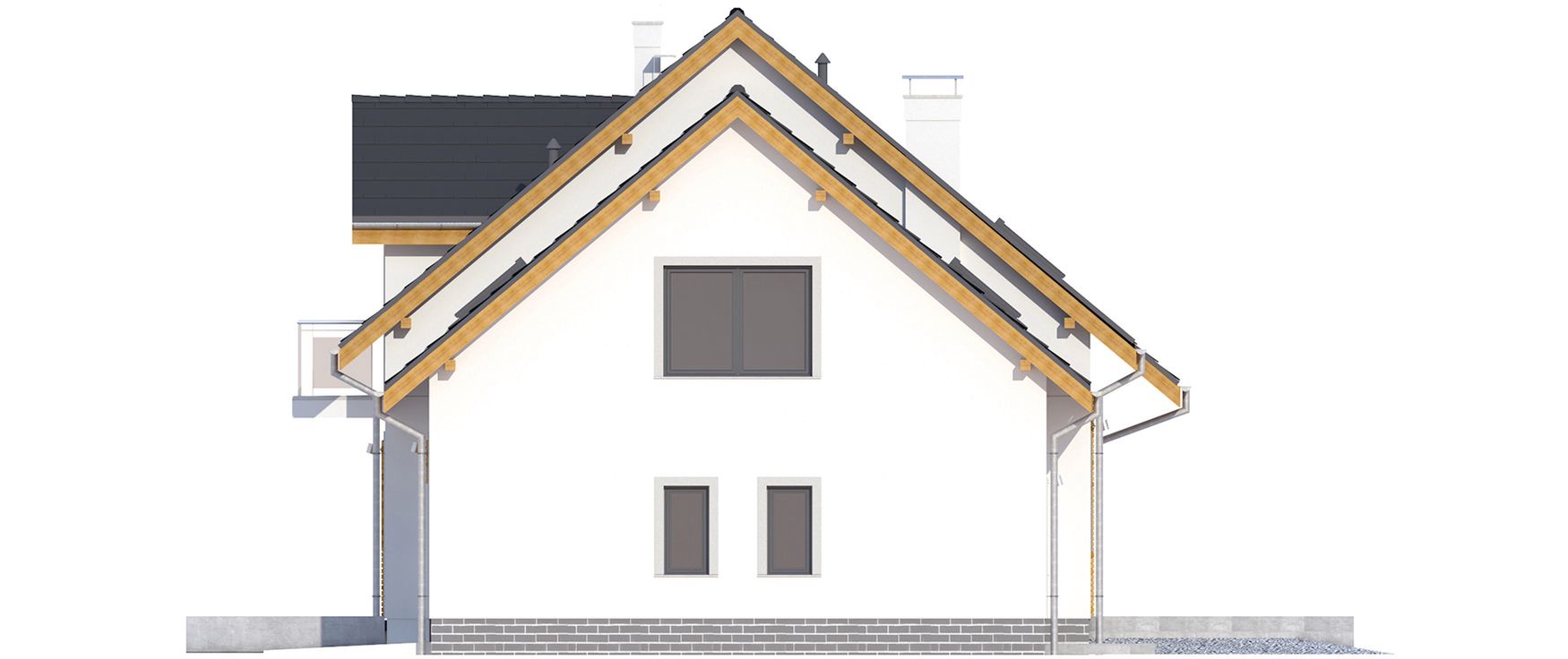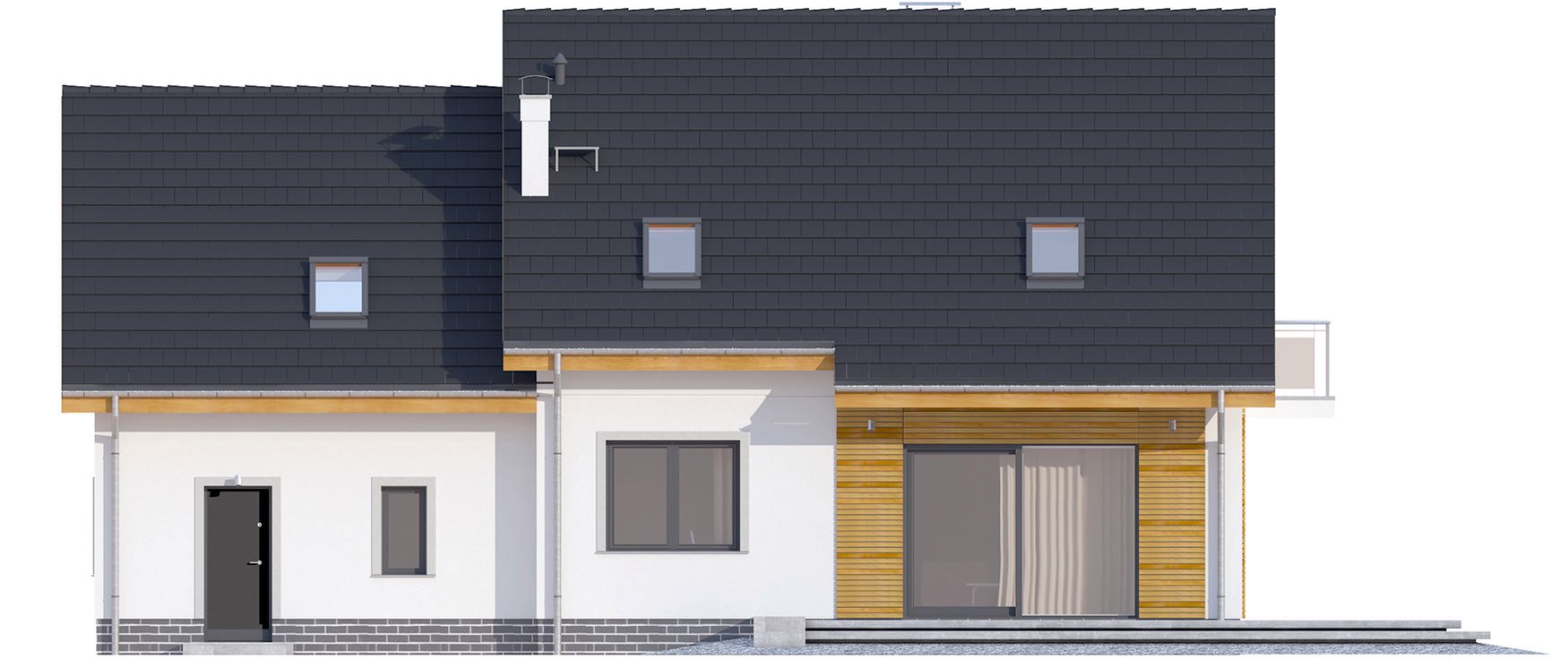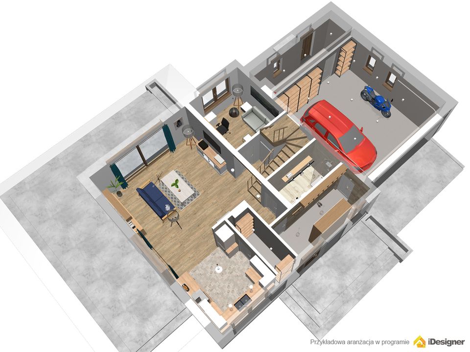 Graficzne opracowanie rzutów poglądowych widocznych na karcie projektu zostało wykonane przez Extradom.pl. Prezentowane przez Extradom.pl wizualizacje wykonane zostały przez autora projektu i należy poczytywać je jedynie za przykład i propozycję wykończenia, wizję architektoniczną autora projektu. Ostateczne wykończenie budynku może nastąpić na wiele sposobów. Szczegółowe rozwiązania zastosowane w oferowanej dokumentacji - w tym również ilość, lokalizacje i wygląd okien, drzwi, kominów - mogą w niewielkim stopniu różnić się od prezentowanej wizualizacji budynku.