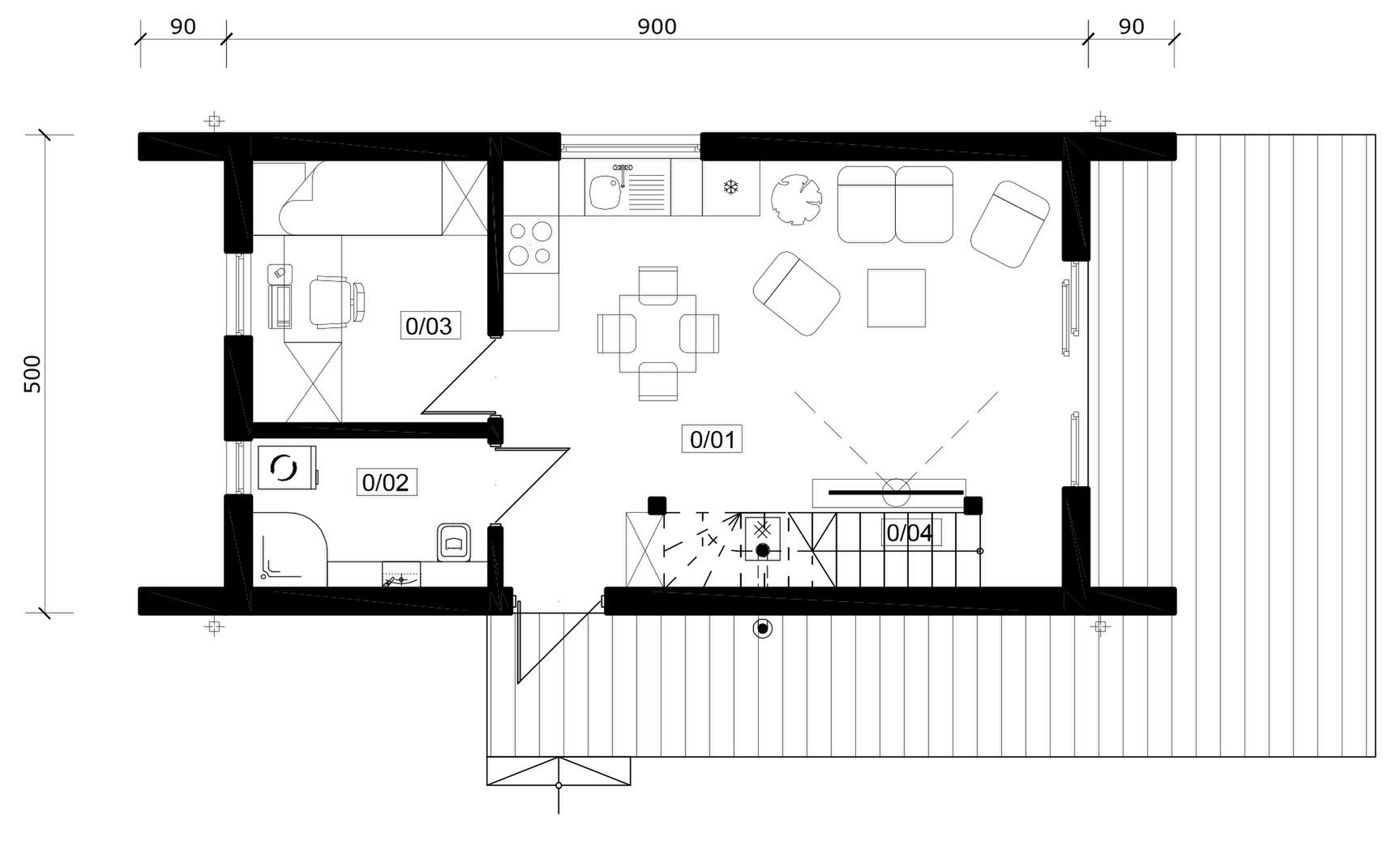 fundamenty: płyta fundamentowa; ściany zewnętrzne: ściana szkieletowa drewniana; ściany wewnętrzne: ściana szkieletowa drewniana; strop: drewniany; konstrukcja i pokrycie dachu: Krewniana krokwiowa, blacha; elewacja: tynk; deska;