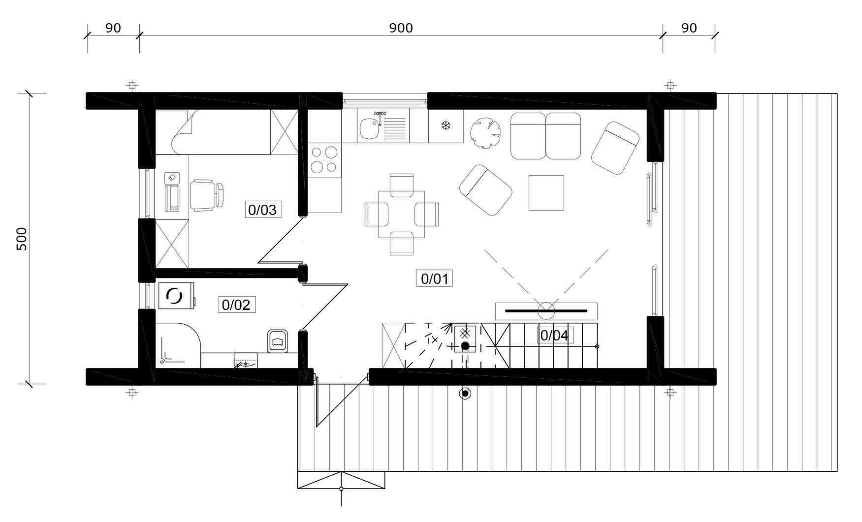 fundamenty: płyta fundamentowa ściany zewnętrzne: ściana szkieletowa drewniana ściany wewnętrzne: ściana szkieletowa drewniana strop: drewniany konstrukcja i pokrycie dachu: drewniana krokwiowa, blacha elewacja: tynk; deska