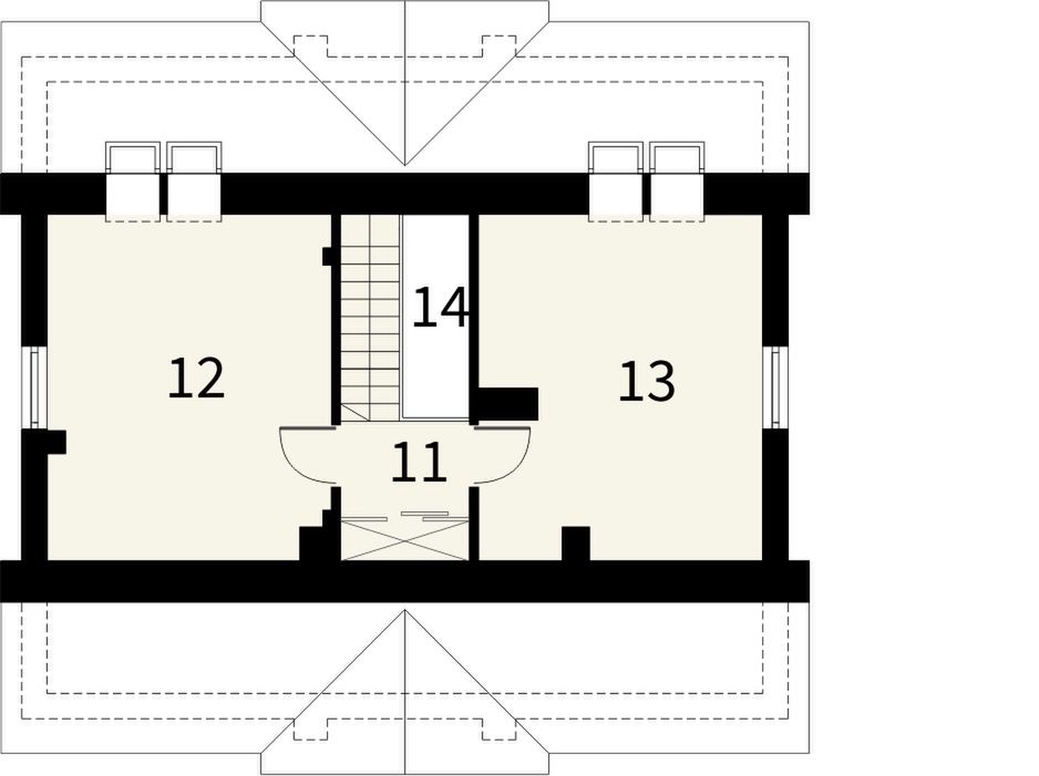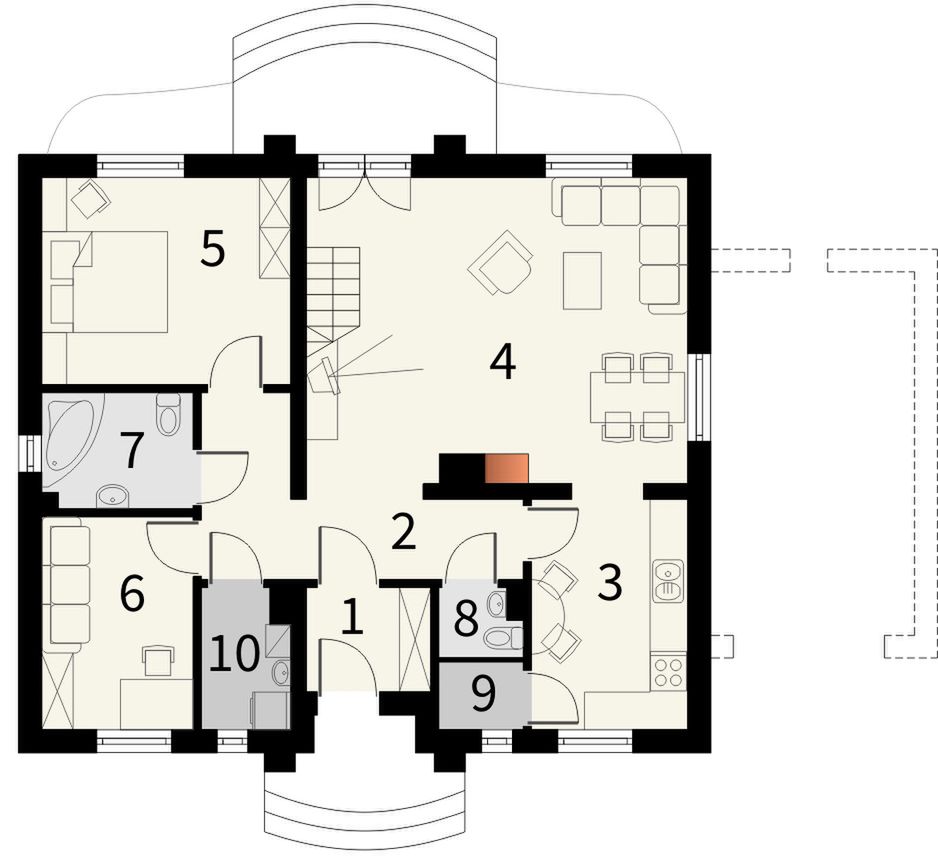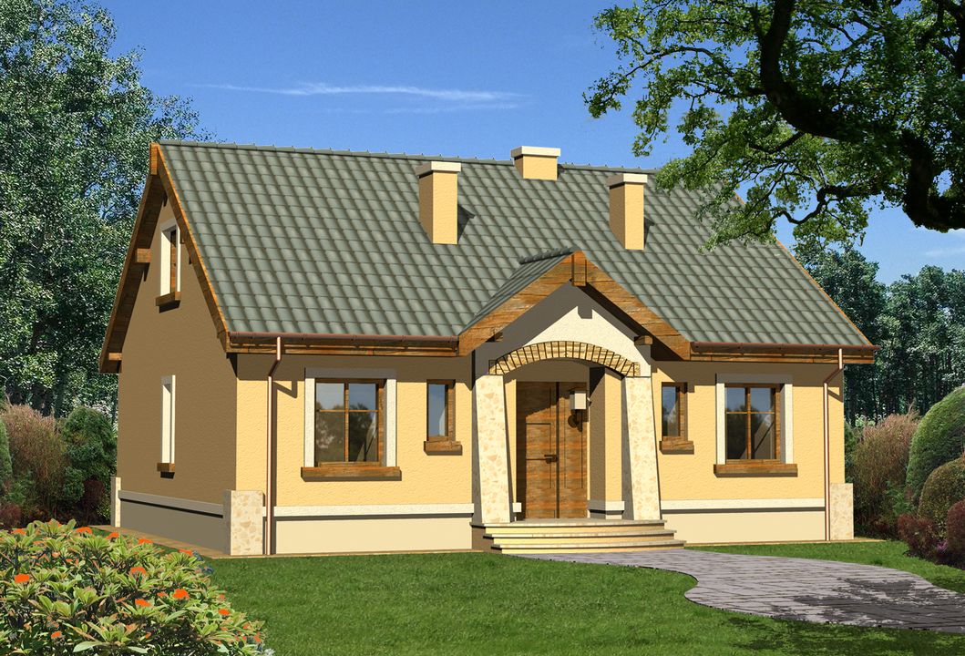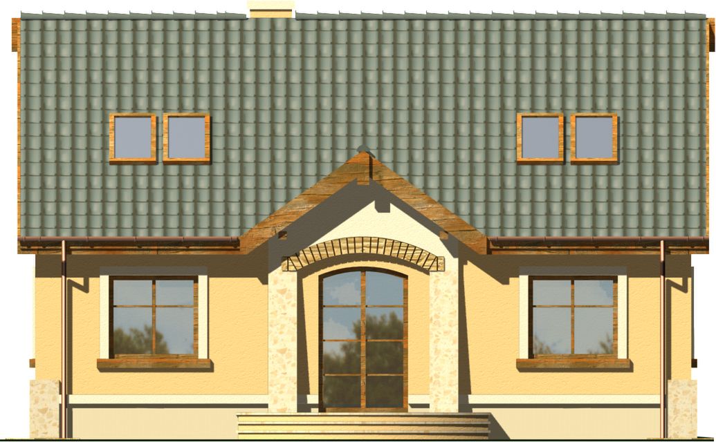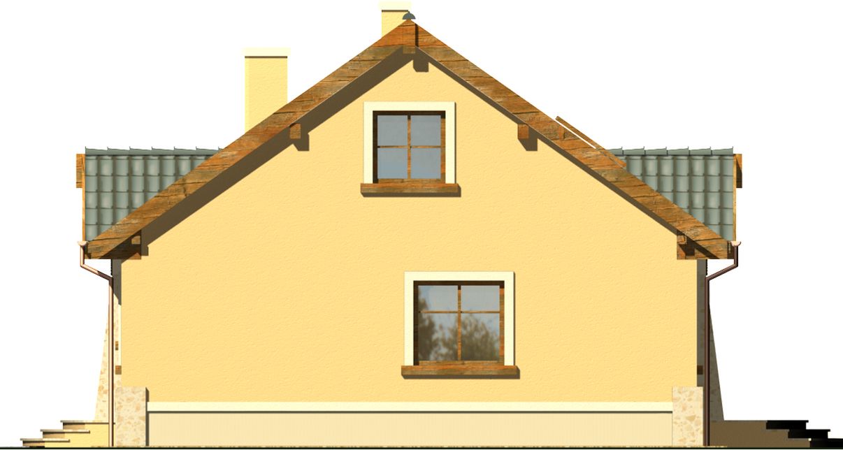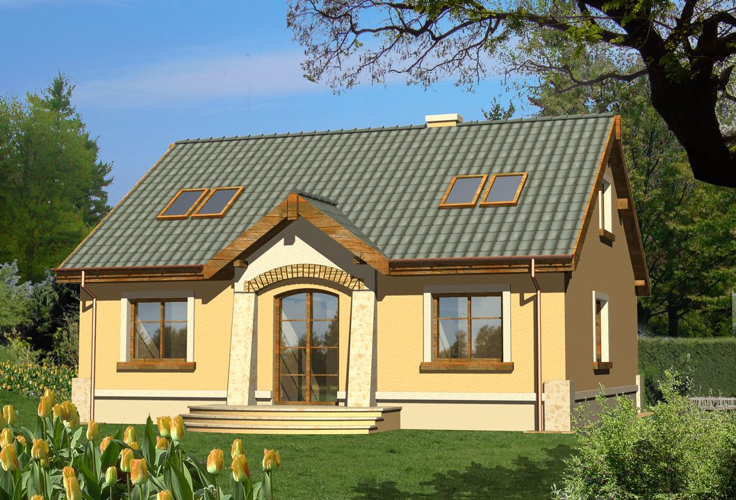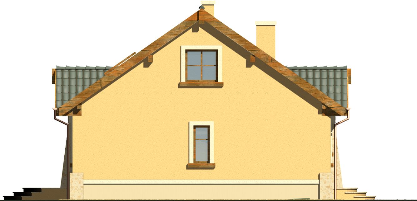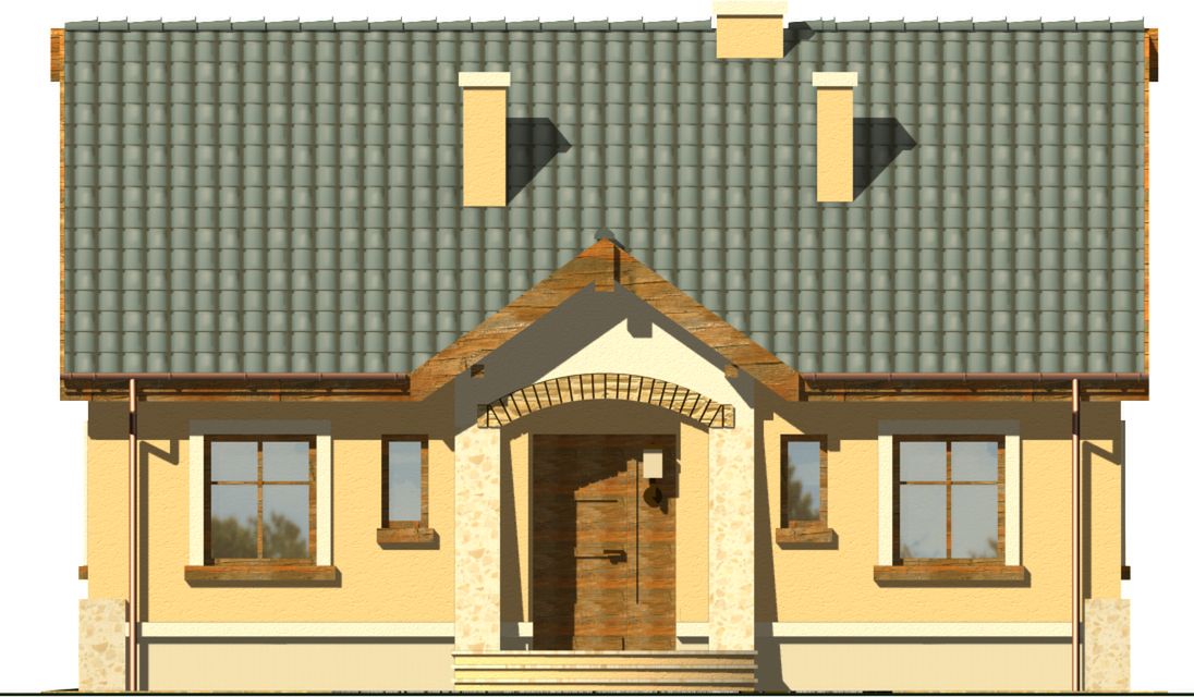 Graficzne opracowanie rzutów poglądowych widocznych na karcie projektu zostało wykonane przez Extradom.pl. Prezentowane przez Extradom.pl wizualizacje wykonane zostały przez autora projektu i należy poczytywać je jedynie za przykład i propozycję wykończenia, wizję architektoniczną autora projektu. Ostateczne wykończenie budynku może nastąpić na wiele sposobów. Szczegółowe rozwiązania zastosowane w oferowanej dokumentacji - w tym również ilość, lokalizacje i wygląd okien, drzwi, kominów - mogą w niewielkim stopniu różnić się od prezentowanej wizualizacji budynku.