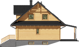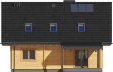 Wysokość ścianki kolankowej: 0.8 m. Strop: drewniany. Pokrycie dachu: dachówka gontopodobna Gerard Corona. Ściany zewnętrzne: płazy drewniane + wełna mineralna + deska. Ściany wewnętrzne: płazy drewniane. Typ ogrzewania: kocioł gazowy lub kocioł na paliwo stałe. Instalacje dodatkowe: instalacja solarna. Inne: okna połaciowe Velux, brama garażowa i drzwi Hörmann.