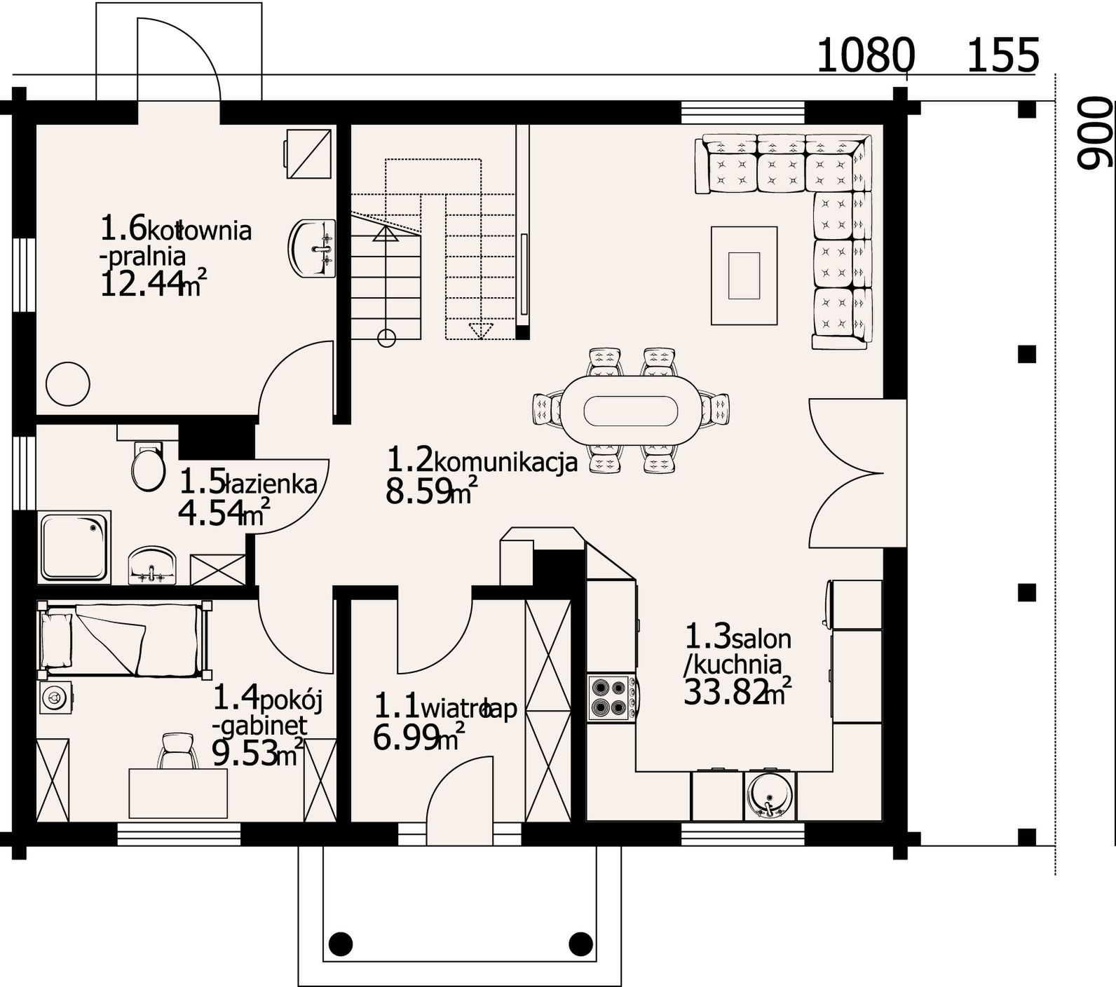 Graficzne opracowanie rzutów poglądowych widocznych na karcie projektu zostało wykonane przez Extradom.pl. Prezentowane przez Extradom.pl wizualizacje wykonane zostały przez autora projektu i należy poczytywać je jedynie za przykład i propozycję wykończenia, wizję architektoniczną autora projektu. Ostateczne wykończenie budynku może nastąpić na wiele sposobów. Szczegółowe rozwiązania zastosowane w oferowanej dokumentacji - w tym również ilość, lokalizacje i wygląd okien, drzwi, kominów - mogą w niewielkim stopniu różnić się od prezentowanej wizualizacji budynku.