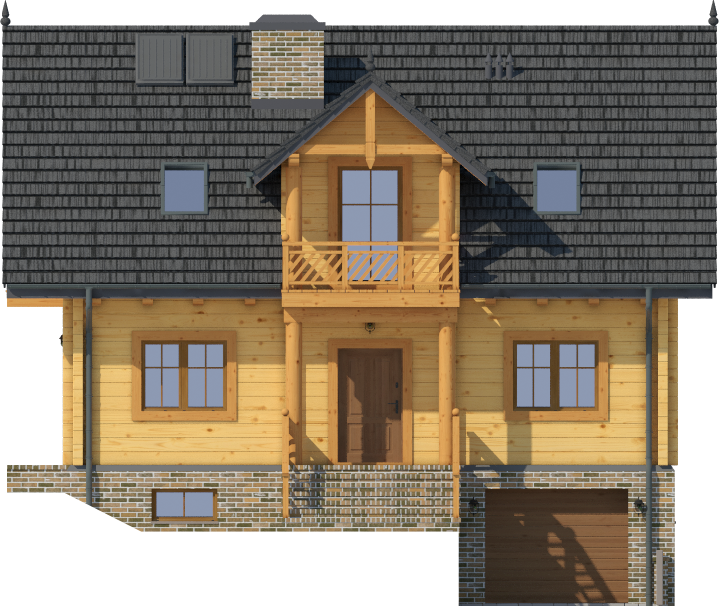 Wysokość ścianki kolankowej: 0.8 m. Strop: żelbet + drewniany. Pokrycie dachu: dachówka gontopodobna Gerard Corona. Ściany zewnętrzne: płazy drewniane + wełna mineralna + deska. Ściany wewnętrzne: płazy drewniane. Typ ogrzewania: kocioł gazowy lub kocioł na paliwo stałe. Instalacje dodatkowe: instalacja solarna. Inne: okna połaciowe Fakro, brama garażowa Hörmann.