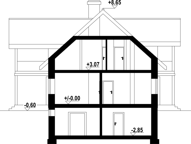 Wysokość ścianki kolankowej: 1.02 m. Strop: płyta żelbetowa. Pokrycie dachu: dachówka ceramiczna. Ściany zewnętrzne: pustaki ceramiczne + wełna + cegła. Ściany wewnętrzne: pustaki ceramiczne. Typ ogrzewania: kocioł na paliwo stałe. Instalacje dodatkowe: instalacja wentylacji mech. z rekuperacją. Inne: okna połaciowe Velux.