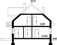 Wysokość ścianki kolankowej: 1.1 m. Strop: płyta żelbetowa. Pokrycie dachu: dachówka ceramiczna. Ściany zewnętrzne: pustaki ceramiczne + styropian. Ściany wewnętrzne: pustaki ceramiczne. Typ ogrzewania: kocioł gazowy lub kocioł na paliwo stałe.