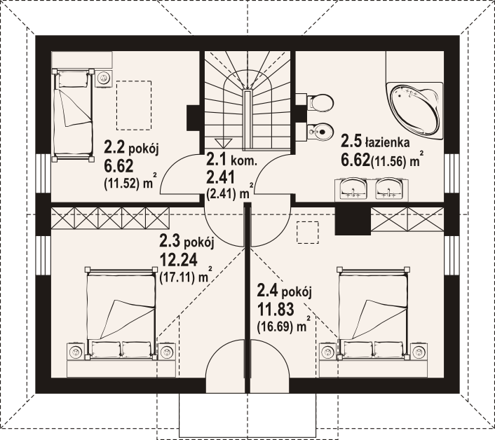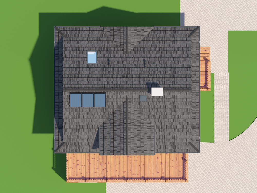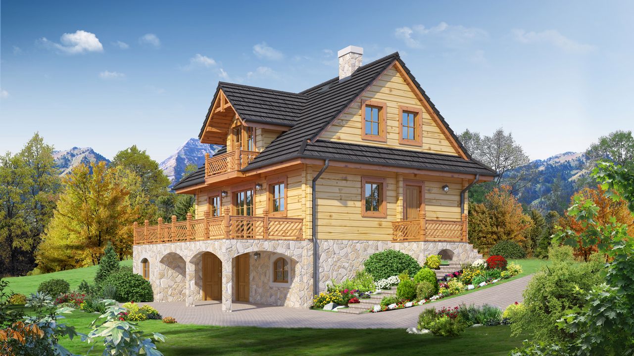 Graficzne opracowanie rzutów poglądowych widocznych na karcie projektu zostało wykonane przez Extradom.pl. Prezentowane przez Extradom.pl wizualizacje wykonane zostały przez autora projektu i należy poczytywać je jedynie za przykład i propozycję wykończenia, wizję architektoniczną autora projektu. Ostateczne wykończenie budynku może nastąpić na wiele sposobów. Szczegółowe rozwiązania zastosowane w oferowanej dokumentacji - w tym również ilość, lokalizacje i wygląd okien, drzwi, kominów - mogą w niewielkim stopniu różnić się od prezentowanej wizualizacji budynku.