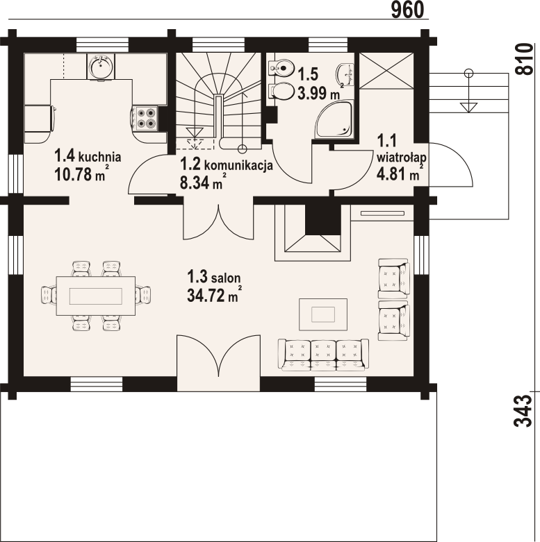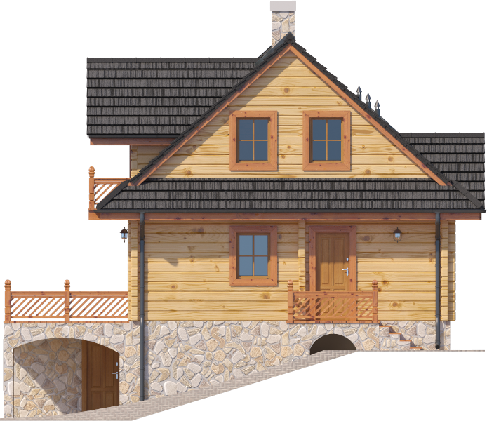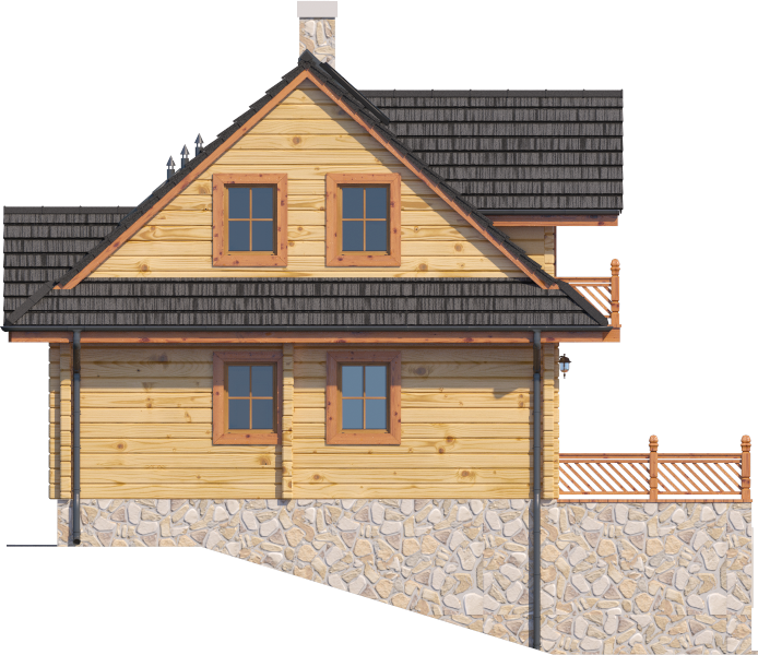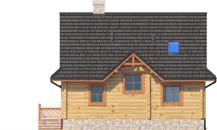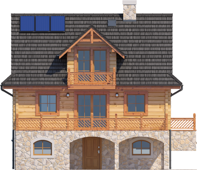Wysokość ścianki kolankowej: 0.43 m. Ilość drewna na więźbę: 6.12 m³. Strop: żelbet + drewniany. Pokrycie dachu: dachówka gontopodobna z posypką Gerard Corona. Ściany zewnętrzne: płazy drewniane + wełna mineralna + deska. Ściany wewnętrzne: płazy drewniane. Typ ogrzewania: kocioł gazowy lub kocioł na paliwo stałe. Instalacje dodatkowe: instalacja solarna.