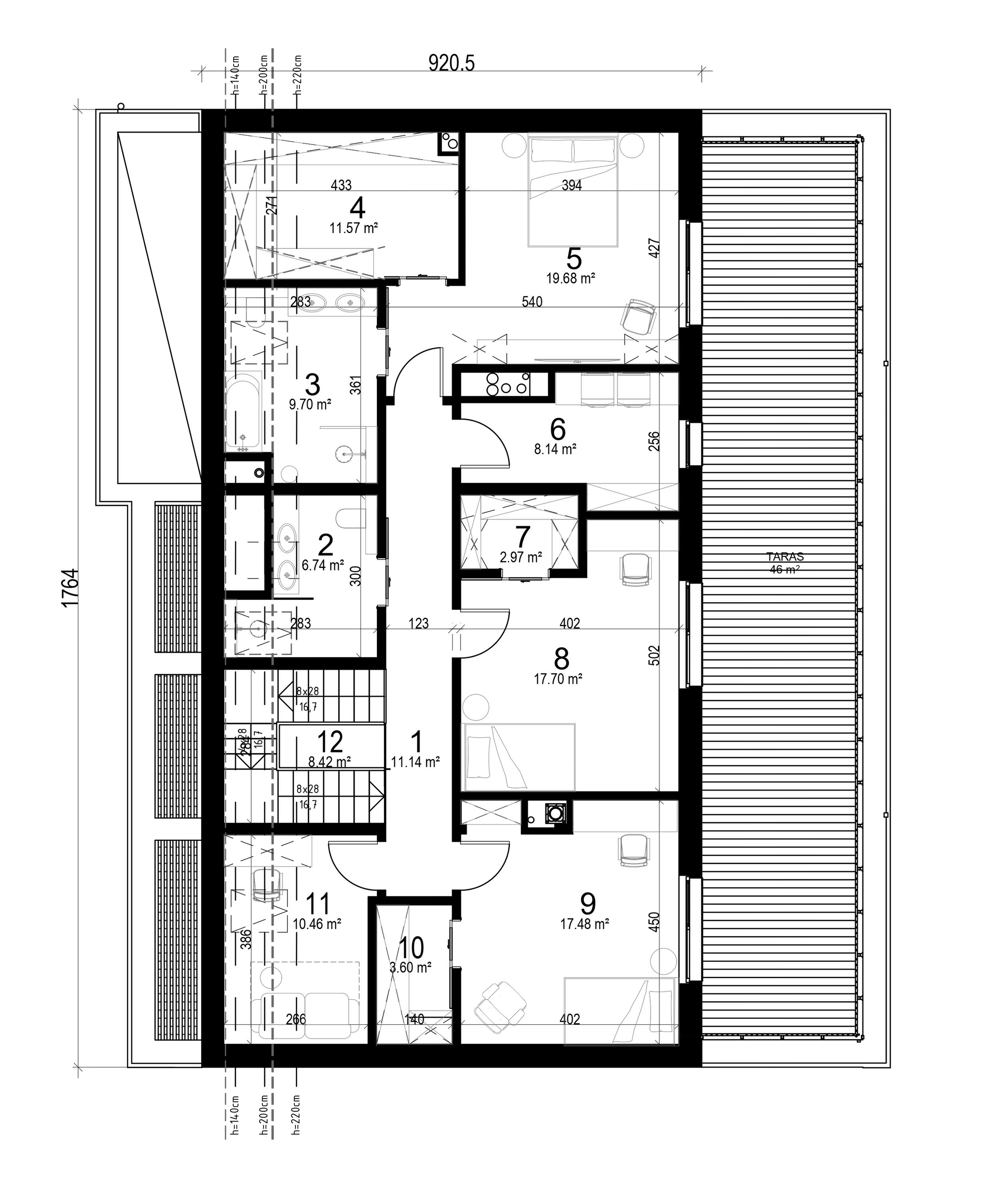 fundamenty: ława fundamentowa ściany zewnętrzne: bloczki silikatowe 18 cm + styropian 20 cm ściany wewnętrzne: bloczki silikatowe 18 cm/12 cm/8 cm strop: żelbetowy konstrukcja i pokrycie dachu: drewniana, dachówka ceramiczna elewacja: płytka klinkierowa
