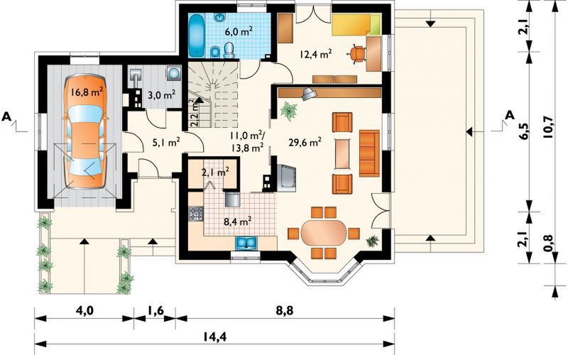 Technologia i konstrukcja: murowana – beton komórkowy. Ściany zewnętrzne: bloczki z betonu komórkowego TERMALICA + wełna mineralna. Ściany wewnętrzne: bloczki z betonu komórkowego TERMALICA. Strop: gęstożebrowy. Konstrukcja dachu: drewniana, jętkowa. Rodzaj schodów: żelbetowe. Typ ogrzewania: kocioł na gaz. Pokrycie dachu: dachówka cementowa. Elewacja: tynki cementowo-wapienne lub cienkowarstwowe silikonowe, silikatowe, mineralne.