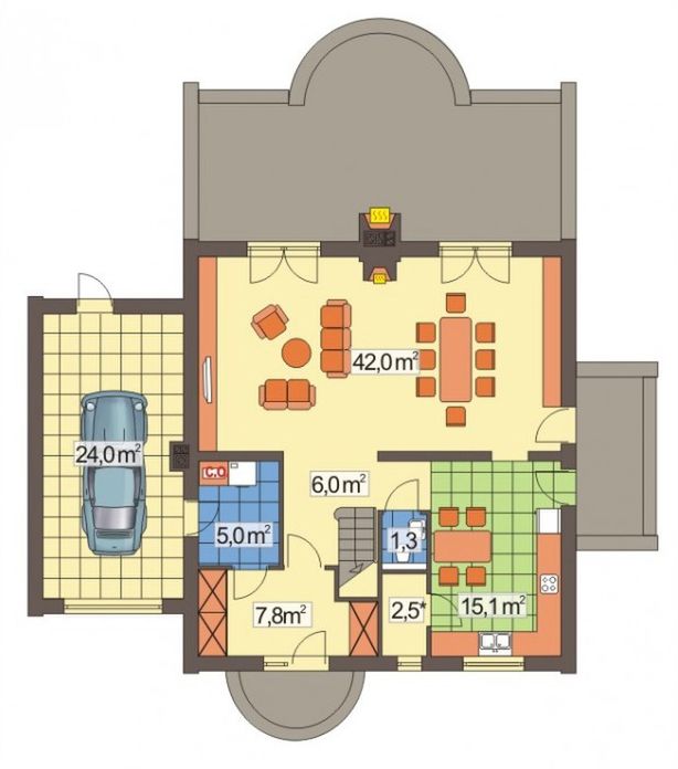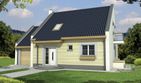 Graficzne opracowanie rzutów poglądowych widocznych na karcie projektu zostało wykonane przez Extradom.pl. Prezentowane przez Extradom.pl wizualizacje wykonane zostały przez autora projektu i należy poczytywać je jedynie za przykład i propozycję wykończenia, wizję architektoniczną autora projektu. Ostateczne wykończenie budynku może nastąpić na wiele sposobów. Szczegółowe rozwiązania zastosowane w oferowanej dokumentacji - w tym również ilość, lokalizacje i wygląd okien, drzwi, kominów - mogą w niewielkim stopniu różnić się od prezentowanej wizualizacji budynku.