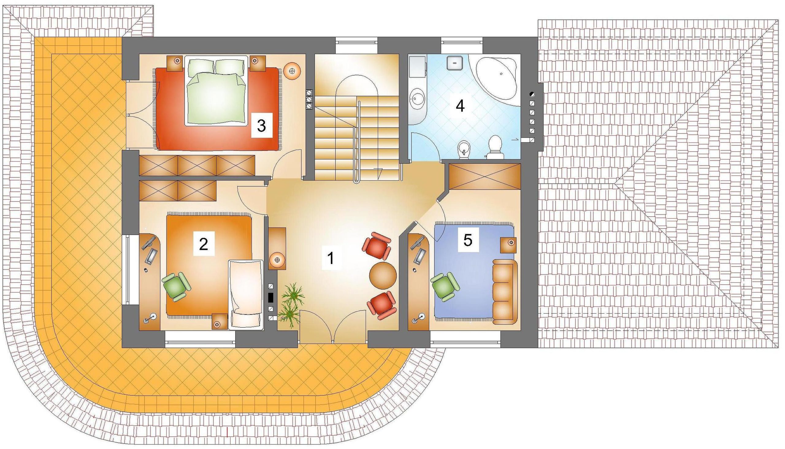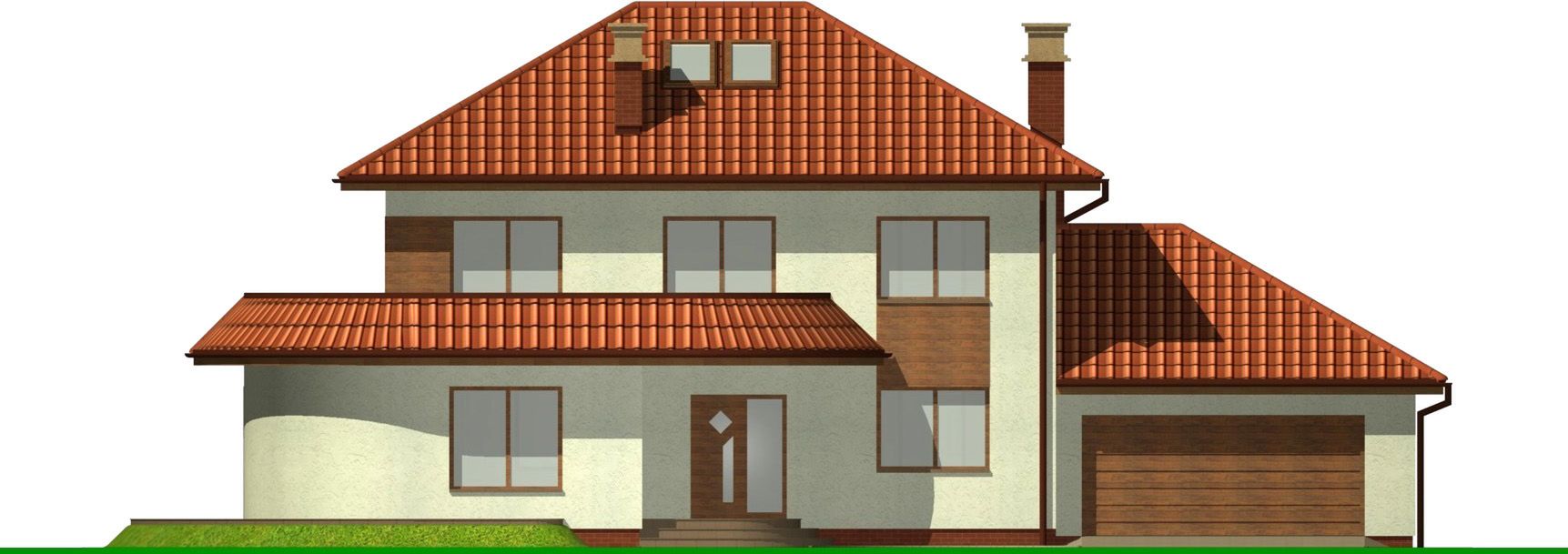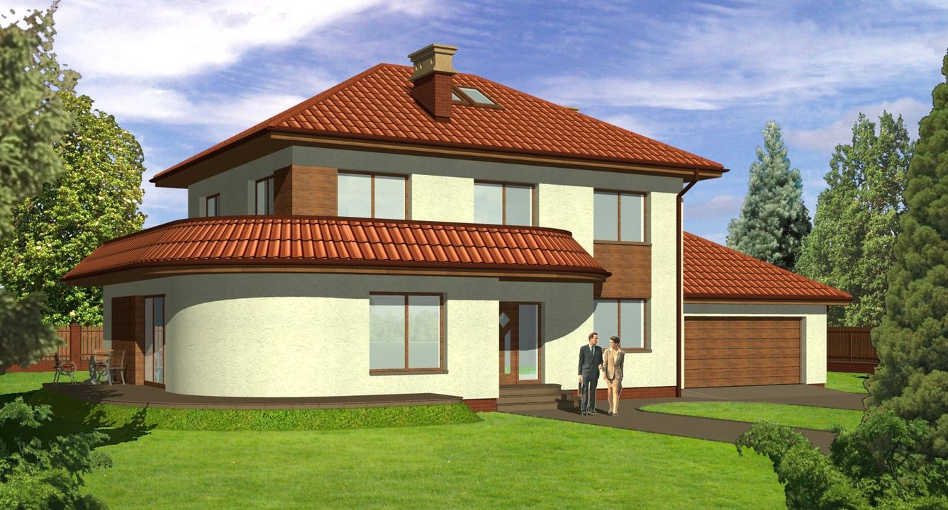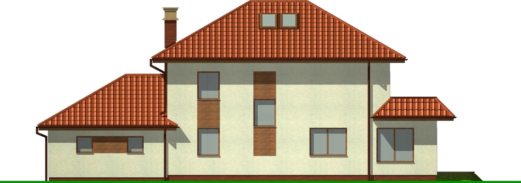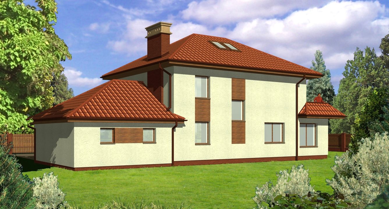 Graficzne opracowanie rzutów poglądowych widocznych na karcie projektu zostało wykonane przez Extradom.pl. Prezentowane przez Extradom.pl wizualizacje wykonane zostały przez autora projektu i należy poczytywać je jedynie za przykład i propozycję wykończenia, wizję architektoniczną autora projektu. Ostateczne wykończenie budynku może nastąpić na wiele sposobów. Szczegółowe rozwiązania zastosowane w oferowanej dokumentacji - w tym również ilość, lokalizacje i wygląd okien, drzwi, kominów - mogą w niewielkim stopniu różnić się od prezentowanej wizualizacji budynku.