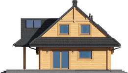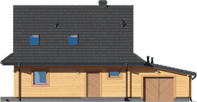 Wysokość ścianki kolankowej: 0.89 m. Strop: drewniany. Pokrycie dachu: dachówka gontopodobna Gerard Corona. Ściany zewnętrzne: płazy drewniane + wełna mineralna + deska. Ściany wewnętrzne: płazy drewniane. Typ ogrzewania: kocioł gazowy. Instalacje dodatkowe: instalacja solarna. Inne: okna połaciowe Velux.