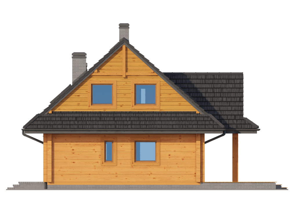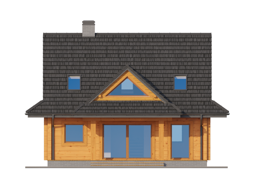 Wysokość ścianki kolankowej: 0.95 m. Strop: drewniany. Pokrycie dachu: dachówka gontopodobna Gerard Corona. Ściany zewnętrzne: płazy drewniane + wełna mineralna + deska. Ściany wewnętrzne: płazy drewniane. Typ ogrzewania: kocioł gazowy. Inne: okna połaciowe Velux.