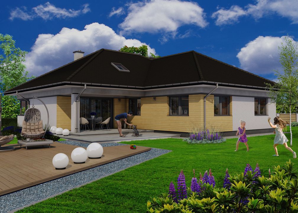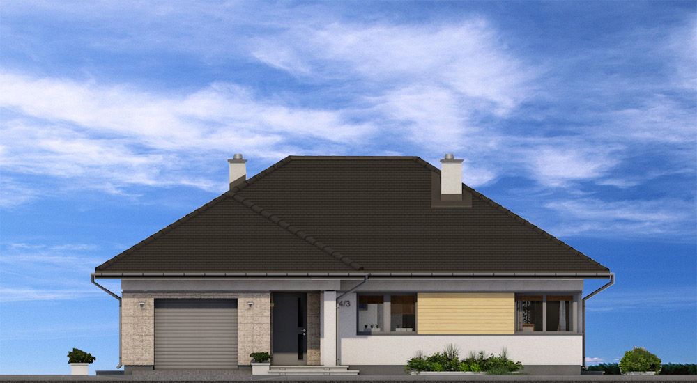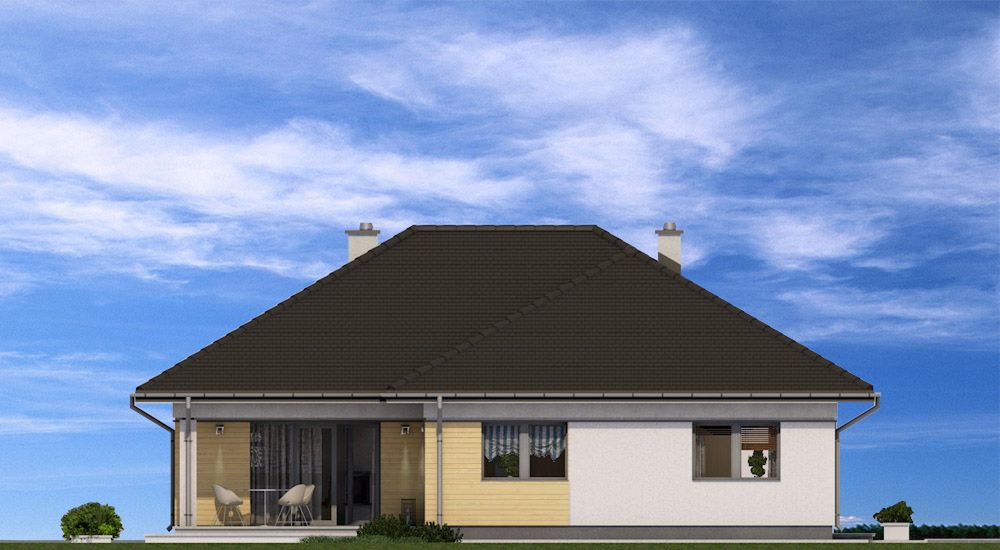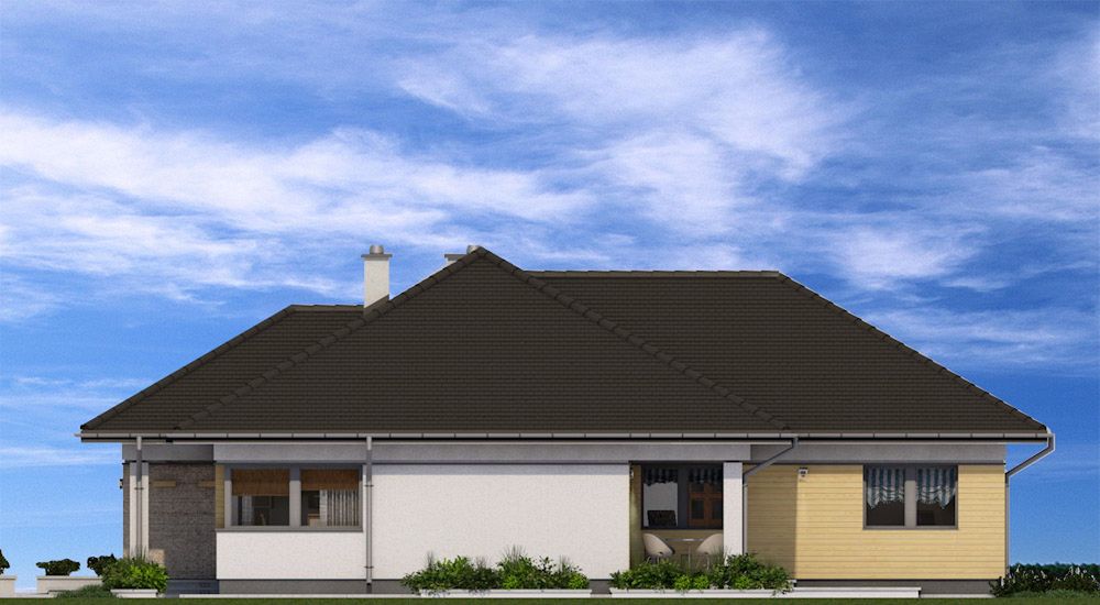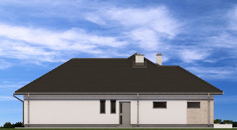 Graficzne opracowanie rzutów poglądowych widocznych na karcie projektu zostało wykonane przez Extradom.pl. Prezentowane przez Extradom.pl wizualizacje wykonane zostały przez autora projektu i należy poczytywać je jedynie za przykład i propozycję wykończenia, wizję architektoniczną autora projektu. Ostateczne wykończenie budynku może nastąpić na wiele sposobów. Szczegółowe rozwiązania zastosowane w oferowanej dokumentacji - w tym również ilość, lokalizacje i wygląd okien, drzwi, kominów - mogą w niewielkim stopniu różnić się od prezentowanej wizualizacji budynku.