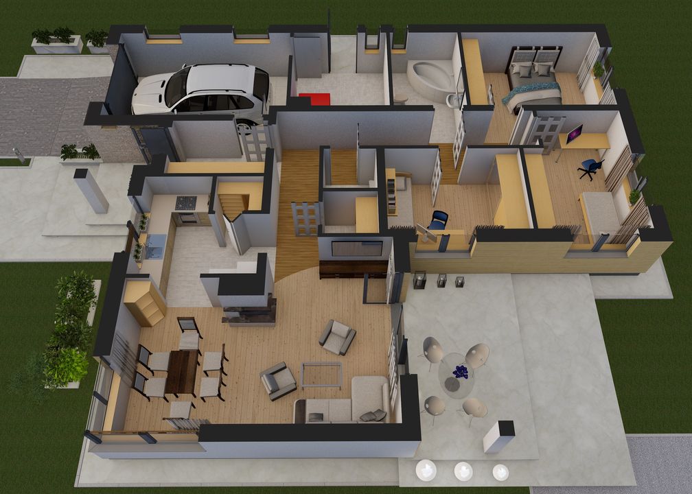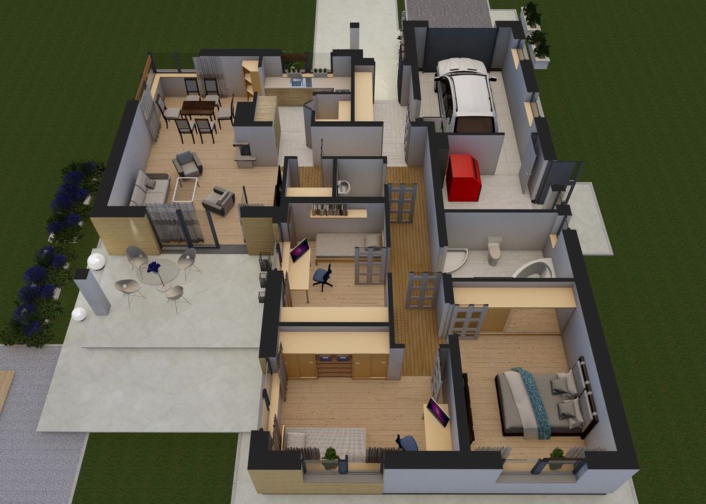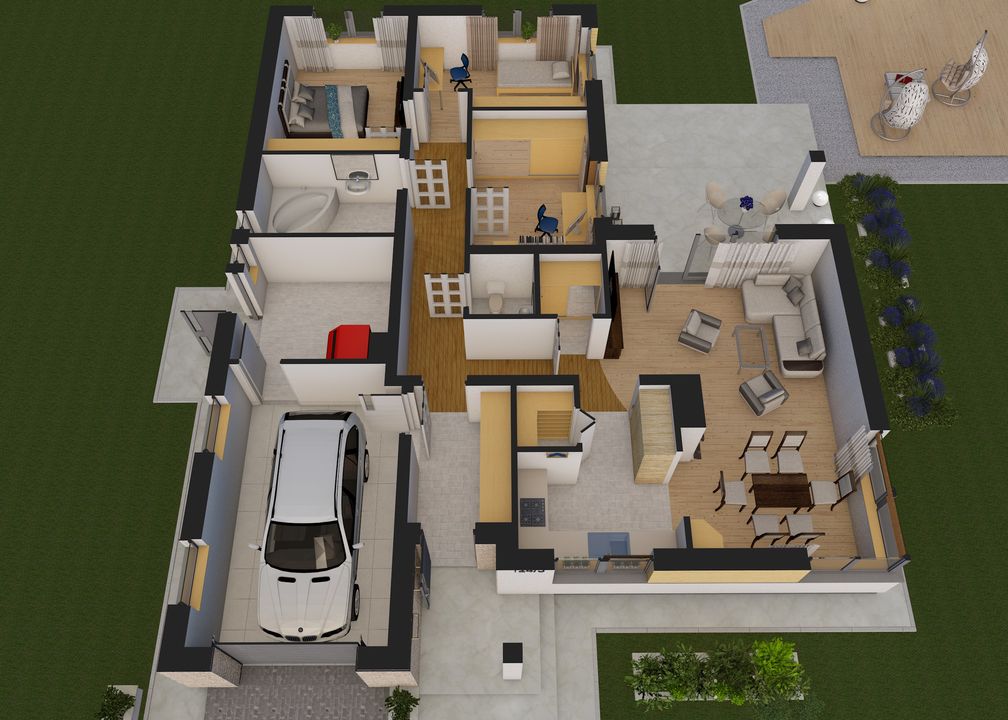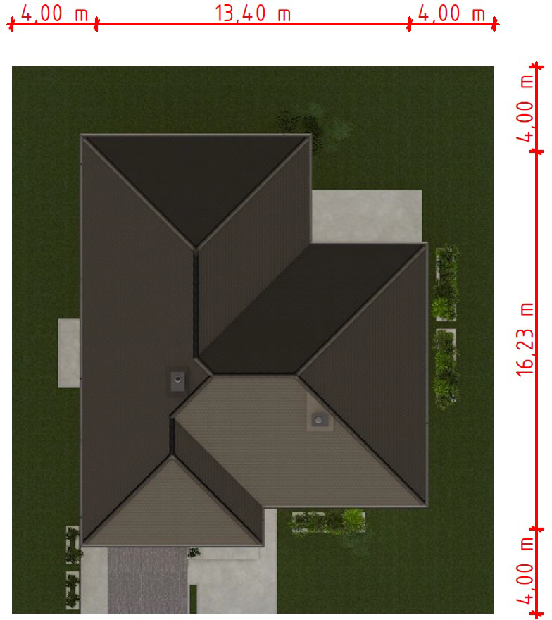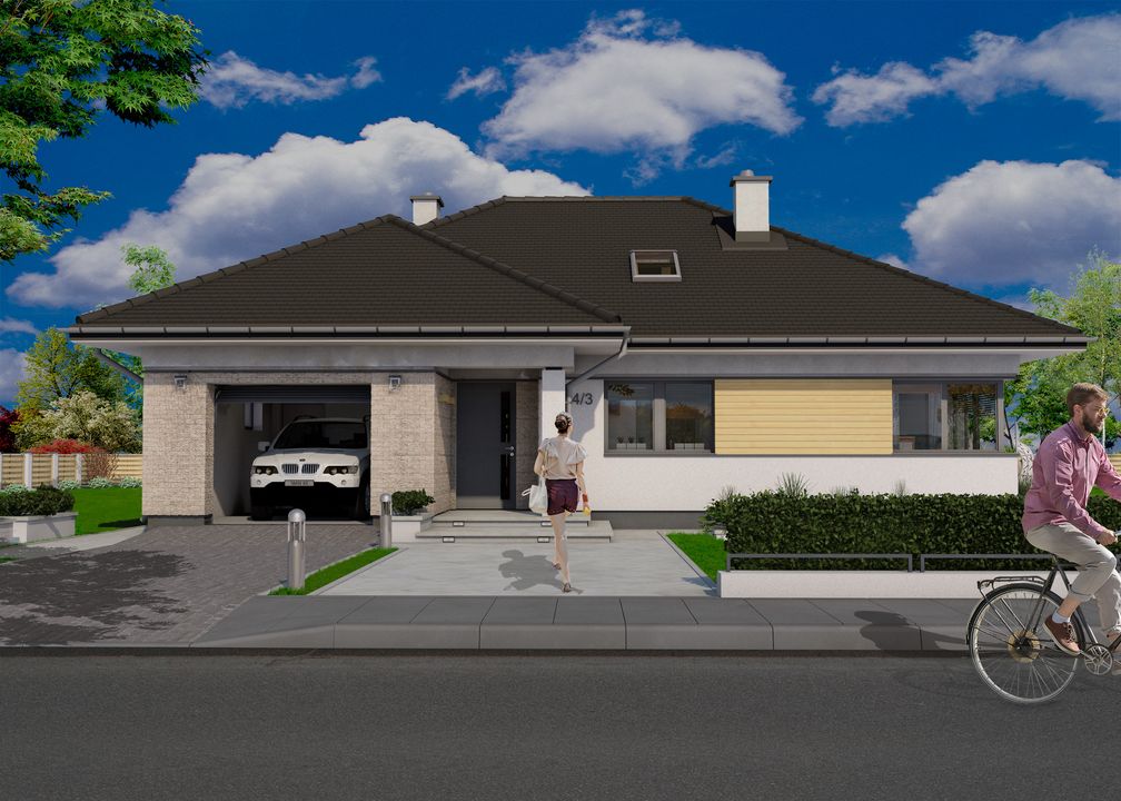Graficzne opracowanie rzutów poglądowych widocznych na karcie projektu zostało wykonane przez Extradom.pl. Prezentowane przez Extradom.pl wizualizacje wykonane zostały przez autora projektu i należy poczytywać je jedynie za przykład i propozycję wykończenia, wizję architektoniczną autora projektu. Ostateczne wykończenie budynku może nastąpić na wiele sposobów. Szczegółowe rozwiązania zastosowane w oferowanej dokumentacji - w tym również ilość, lokalizacje i wygląd okien, drzwi, kominów - mogą w niewielkim stopniu różnić się od prezentowanej wizualizacji budynku.