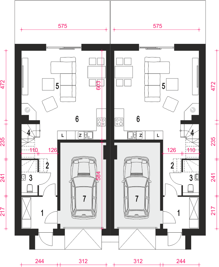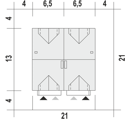 Projekt jest w fazie koncepcji. Przy zakupie projektu należy zapłacić 50% zaliczki. Zaliczka jest bezzwrotna w przypadku zwrotu lub rezygnacji z zamówienia. Budynek dwulokalowy posadowiony na wspólnym fundamencie. Jeśli planujesz budowę na osobnych działkach zamów pojedyncze segmenty: podstawa + lustro.