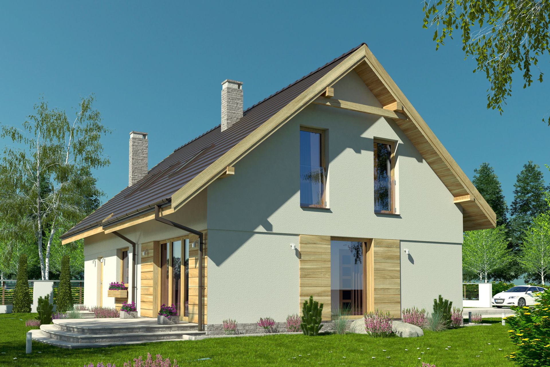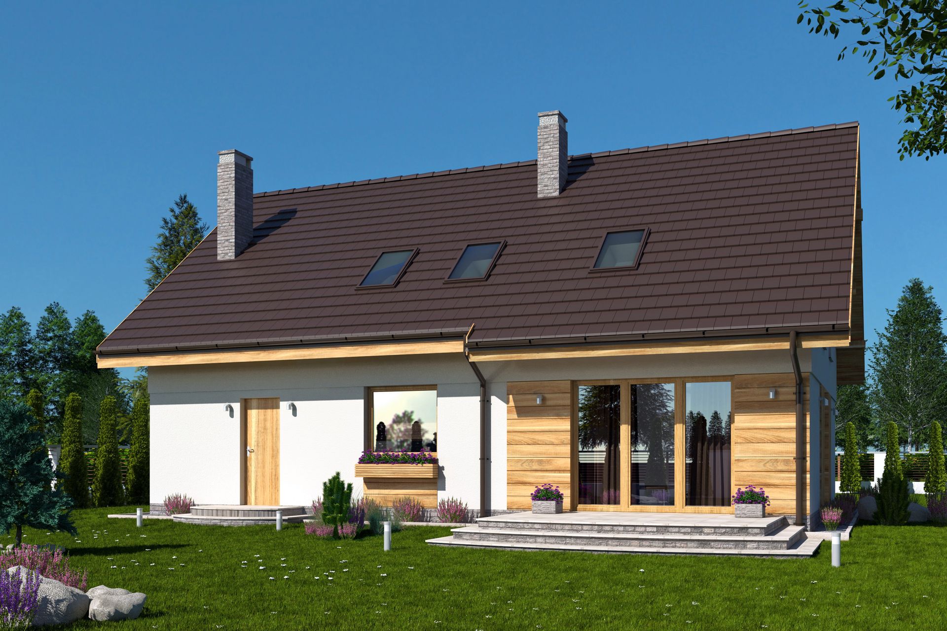 Graficzne opracowanie rzutów poglądowych widocznych na karcie projektu zostało wykonane przez Extradom.pl. Prezentowane przez Extradom.pl wizualizacje wykonane zostały przez autora projektu i należy poczytywać je jedynie za przykład i propozycję wykończenia, wizję architektoniczną autora projektu. Ostateczne wykończenie budynku może nastąpić na wiele sposobów. Szczegółowe rozwiązania zastosowane w oferowanej dokumentacji - w tym również ilość, lokalizacje i wygląd okien, drzwi, kominów - mogą w niewielkim stopniu różnić się od prezentowanej wizualizacji budynku.