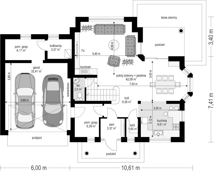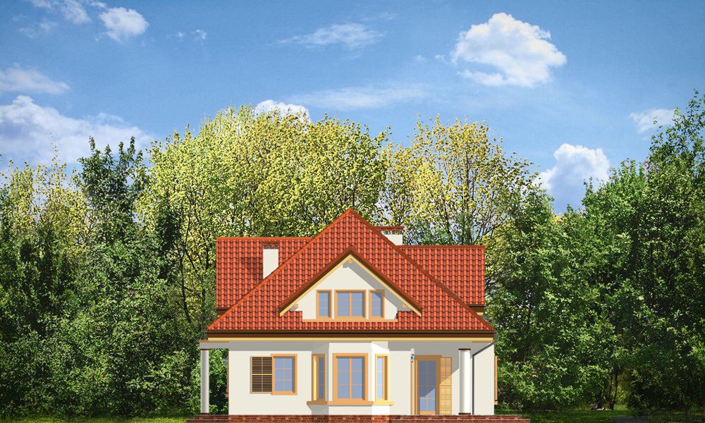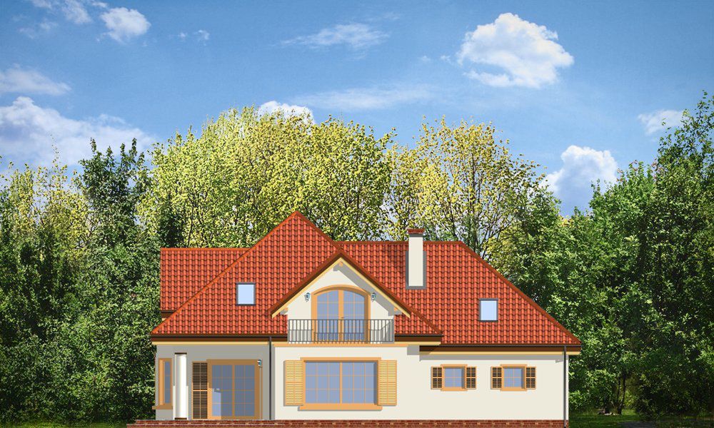 Graficzne opracowanie rzutów poglądowych widocznych na karcie projektu zostało wykonane przez Extradom.pl. Prezentowane przez Extradom.pl wizualizacje wykonane zostały przez autora projektu i należy poczytywać je jedynie za przykład i propozycję wykończenia, wizję architektoniczną autora projektu. Ostateczne wykończenie budynku może nastąpić na wiele sposobów. Szczegółowe rozwiązania zastosowane w oferowanej dokumentacji - w tym również ilość, lokalizacje i wygląd okien, drzwi, kominów - mogą w niewielkim stopniu różnić się od prezentowanej wizualizacji budynku.
