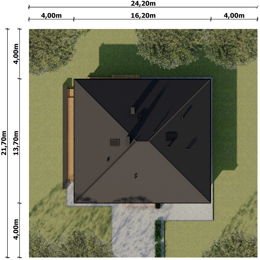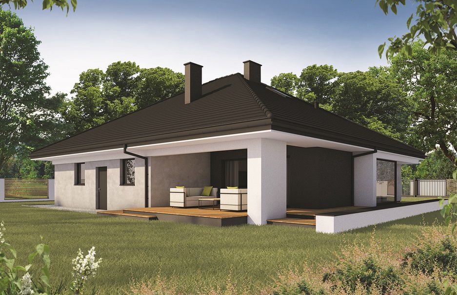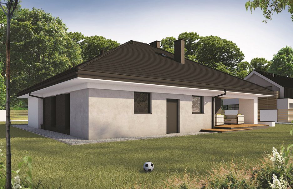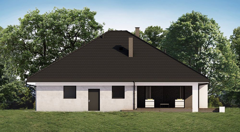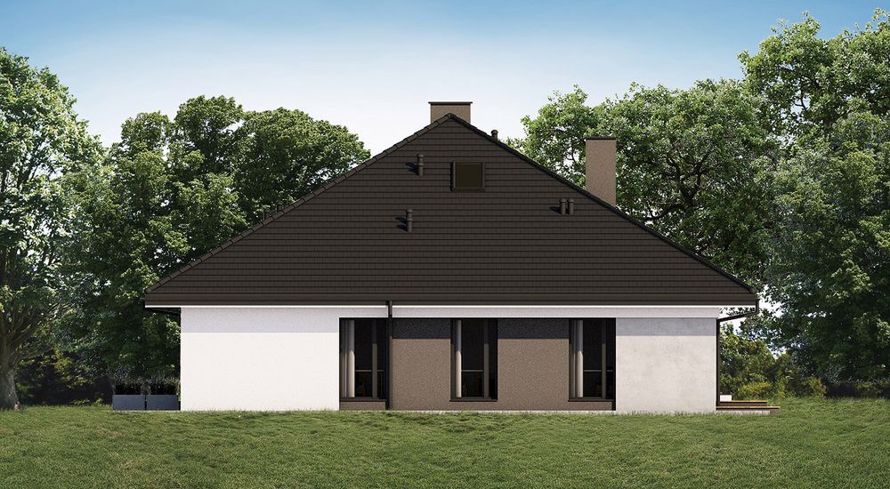 Graficzne opracowanie rzutów poglądowych widocznych na karcie projektu zostało wykonane przez Extradom.pl. Prezentowane przez Extradom.pl wizualizacje wykonane zostały przez autora projektu i należy poczytywać je jedynie za przykład i propozycję wykończenia, wizję architektoniczną autora projektu. Ostateczne wykończenie budynku może nastąpić na wiele sposobów. Szczegółowe rozwiązania zastosowane w oferowanej dokumentacji - w tym również ilość, lokalizacje i wygląd okien, drzwi, kominów - mogą w niewielkim stopniu różnić się od prezentowanej wizualizacji budynku.