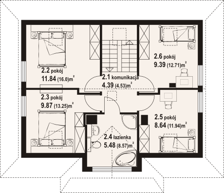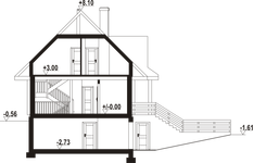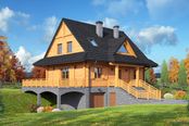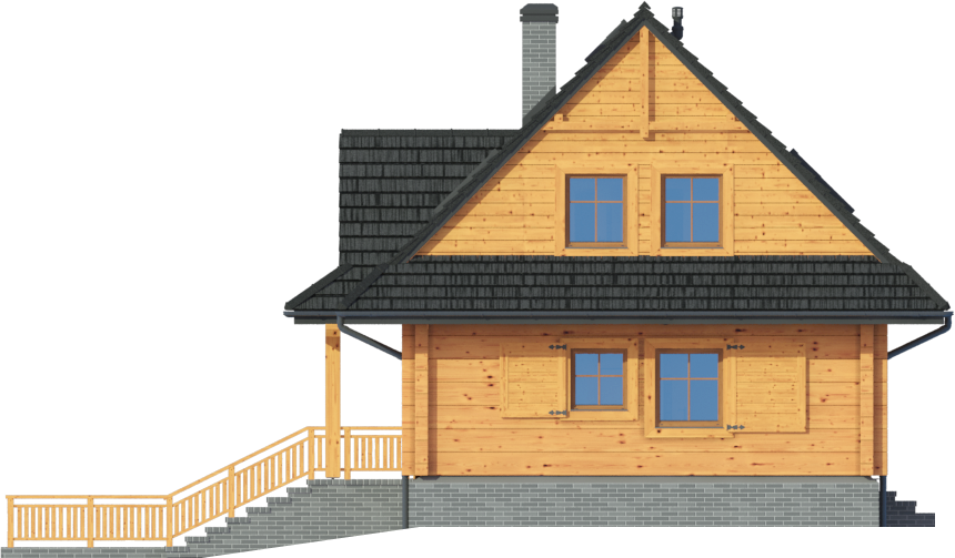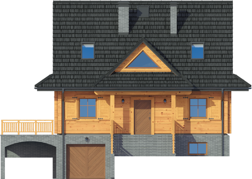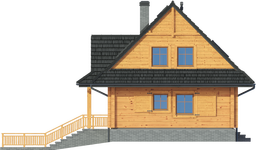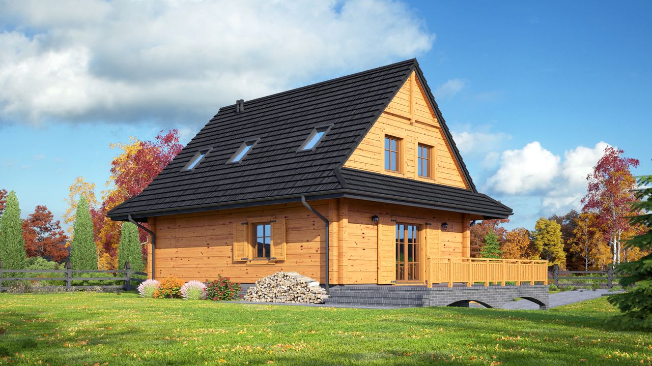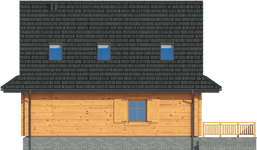 Wysokość ścianki kolankowej: 0.84 m. Strop: żelbet + drewniany. Pokrycie dachu: dachówka gontopodobna Gerard Corona. Ściany zewnętrzne: płazy drewniane + wełna mineralna + deska. Ściany wewnętrzne: płazy drewniane. Typ ogrzewania: kocioł gazowy lub kocioł na paliwo stałe. Inne: okna połaciowe Fakro.