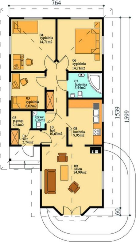 Graficzne opracowanie rzutów poglądowych widocznych na karcie projektu zostało wykonane przez Extradom.pl. Prezentowane przez Extradom.pl wizualizacje wykonane zostały przez autora projektu i należy poczytywać je jedynie za przykład i propozycję wykończenia, wizję architektoniczną autora projektu. Ostateczne wykończenie budynku może nastąpić na wiele sposobów. Szczegółowe rozwiązania zastosowane w oferowanej dokumentacji - w tym również ilość, lokalizacje i wygląd okien, drzwi, kominów - mogą w niewielkim stopniu różnić się od prezentowanej wizualizacji budynku.