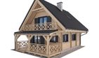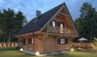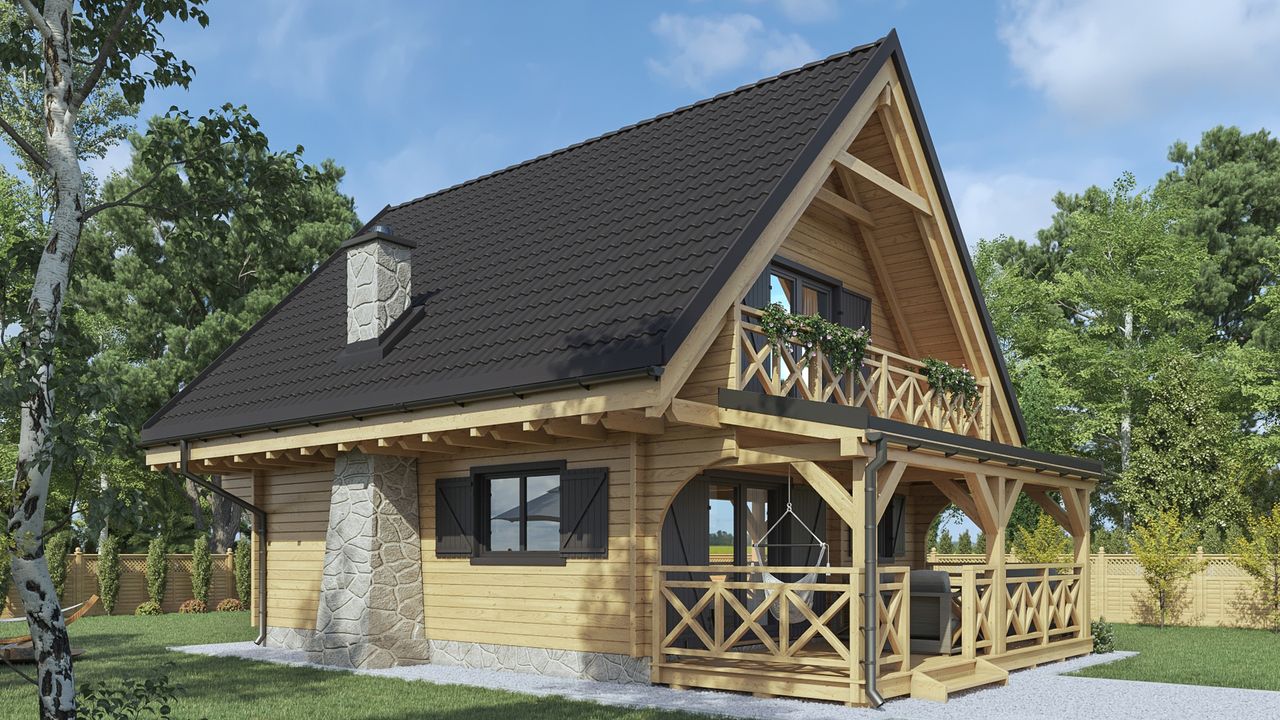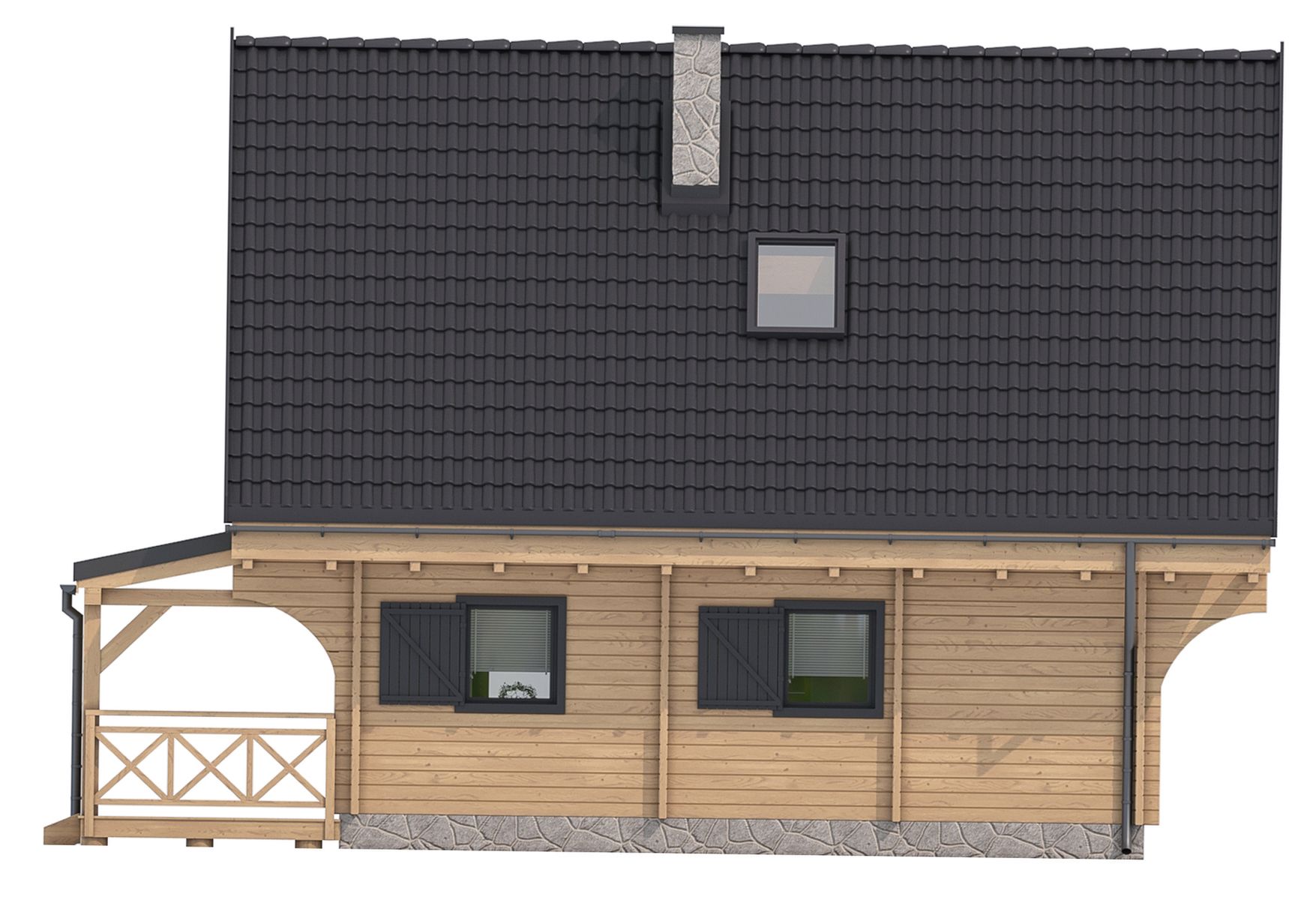 Posadowienie budynku: ława fundamentowa; Ściany zewnętrzne: z balika drewnianego (8cm) + szkieletowa z wełną izolacyjną 20cm; Ściany wewnętrzne: parter: balik drewniany (8cm) lub konstrukcja szkieletowa z płytami g-k (10cm); piętro: konstrukcja szkieletowa z płytami g-k (10cm); Strop nad parterem: drewniany; Konstrukcja dachu: drewniana, krokwiowo jętkowa; Pokrycie dachu: blachodachówka; Elewacja: płazy drewniane 8cm;